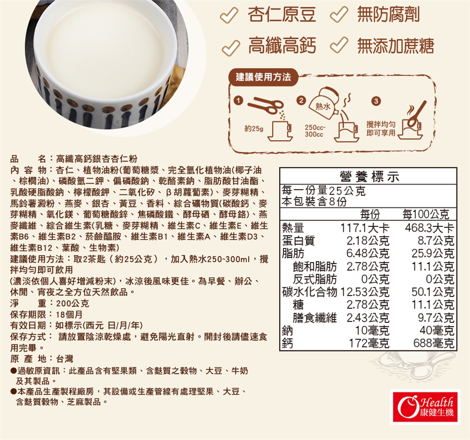 過敏原資訊:此產品含有堅果類、含麩質之穀物、大豆、牛奶及其製品。