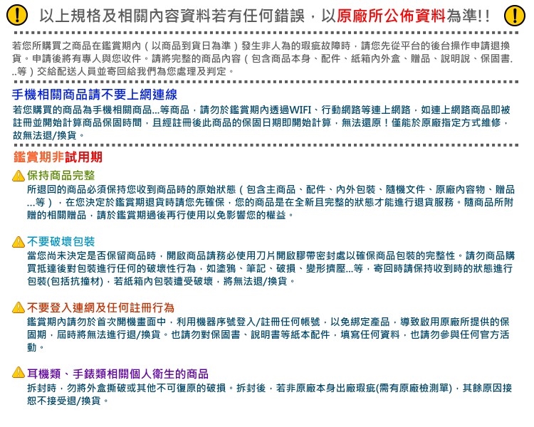 ※鑑賞期非試用期,鑑賞期間手機勿使用密碼鎖機功能、軟體升級、包膜、使用行動網路連線(3G/4G/5G/WIFI)上網註冊IMEI碼、刷機及其他會破壞手機原廠軟體的操作。