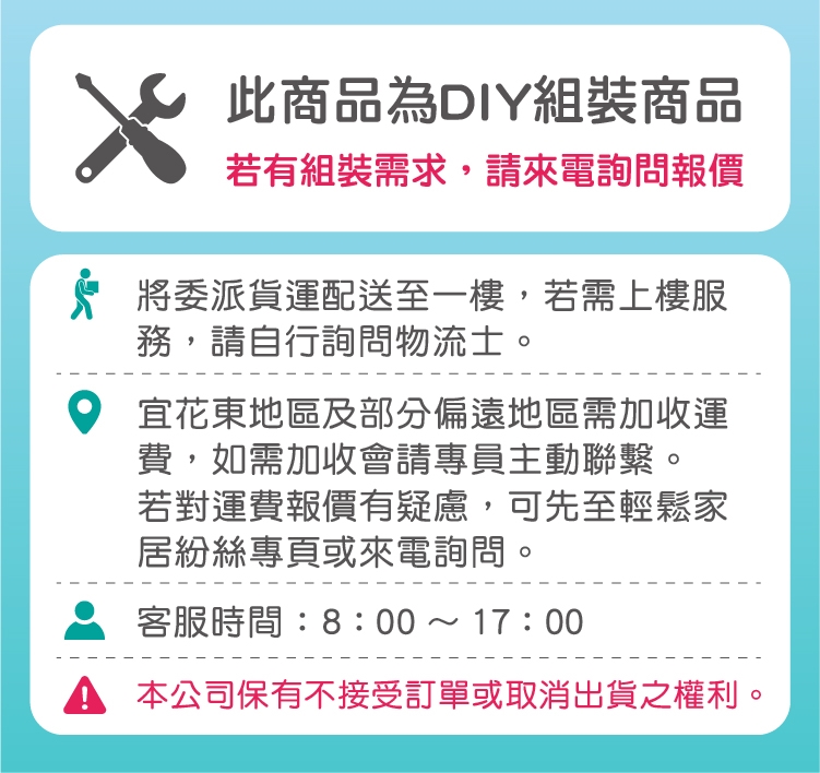 ※ 本公司無提供回收舊家具服務,如有需要請自行連繫當地清潔隊。