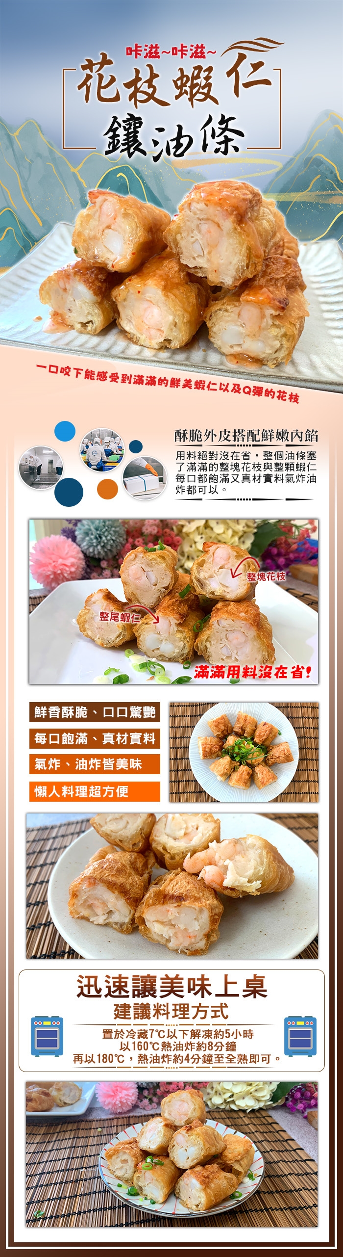 1. 油炸:置於冷藏7℃以下解凍約5小時,以160℃熱油炸約8分鐘,再以180℃,熱油炸約4分鐘至全熟即可。
