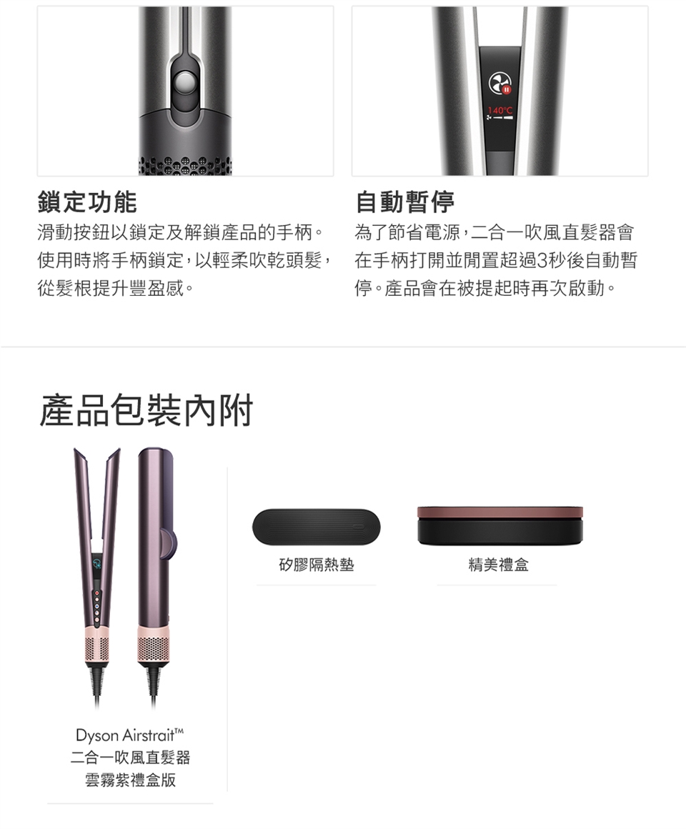 3. 乾濕兩用省時省心:不依賴加熱面板,無熱傷害: 傳統加熱式直髮器,利用高溫造型易造成頭髮斷裂乾枯。Dyson二合一吹風直髮器,提升髮絲強韌度60% / 水潤度28%/ 染髮退色60%