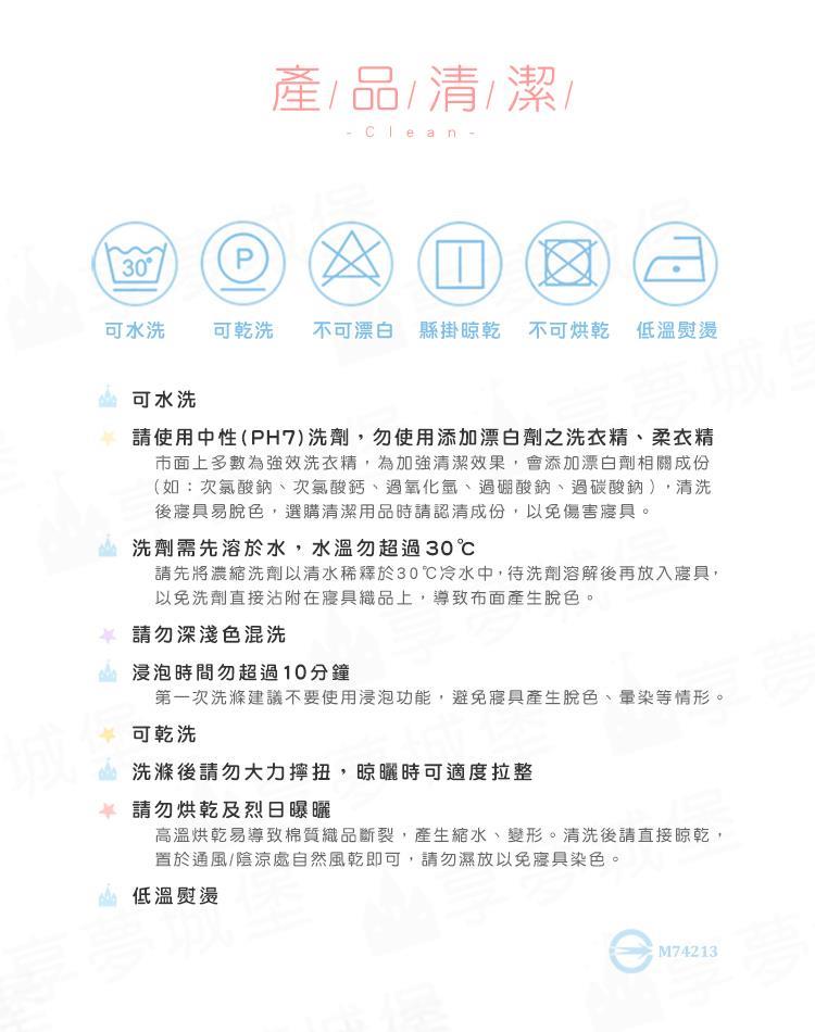 .建議清洗方式:將水置入洗衣機倒入中性清潔劑,再放入寢具商品,以弱速水洗與弱速脫水,自然風乾即可。