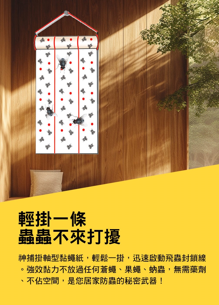 ◆ 強力黏合劑搭配誘引圖案,吸引飛蟲上鉤,提高捕捉率。