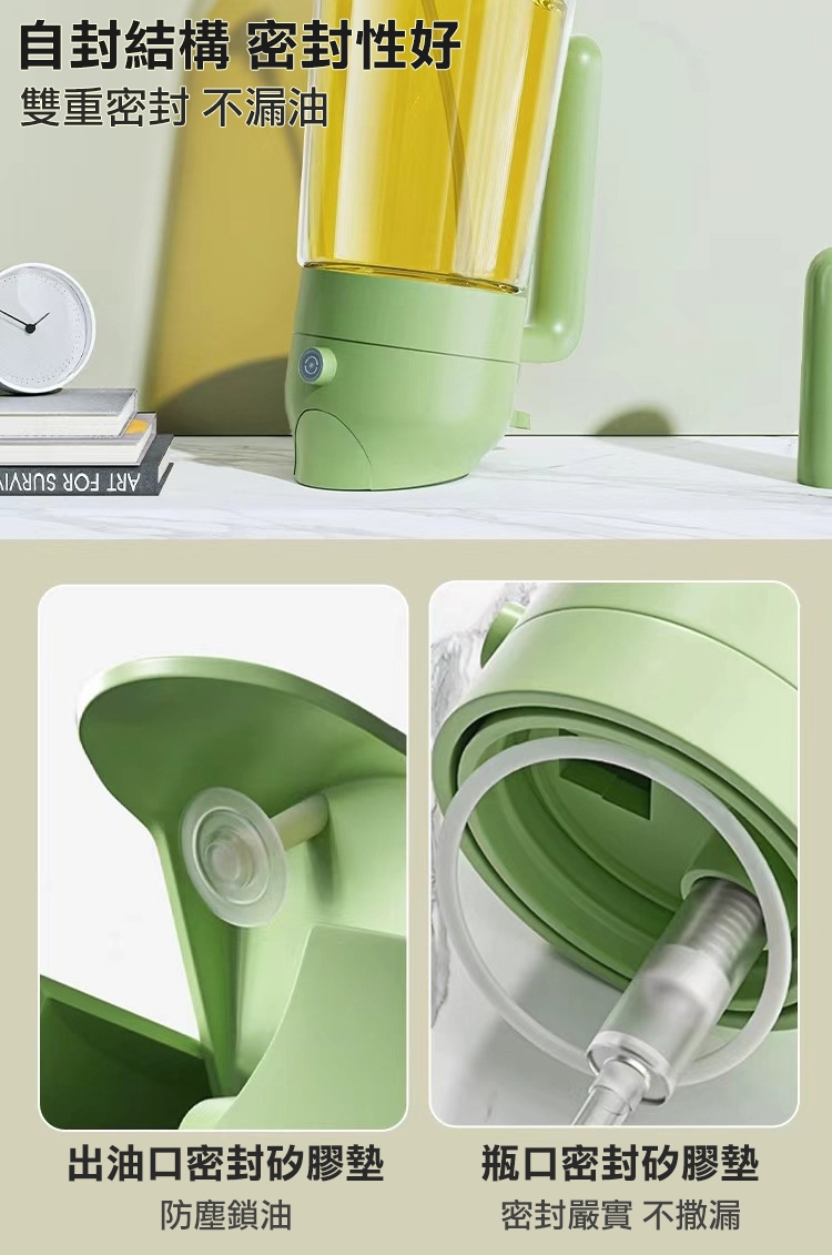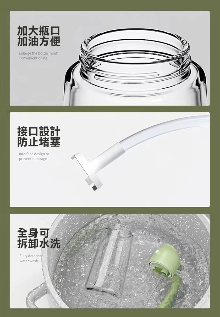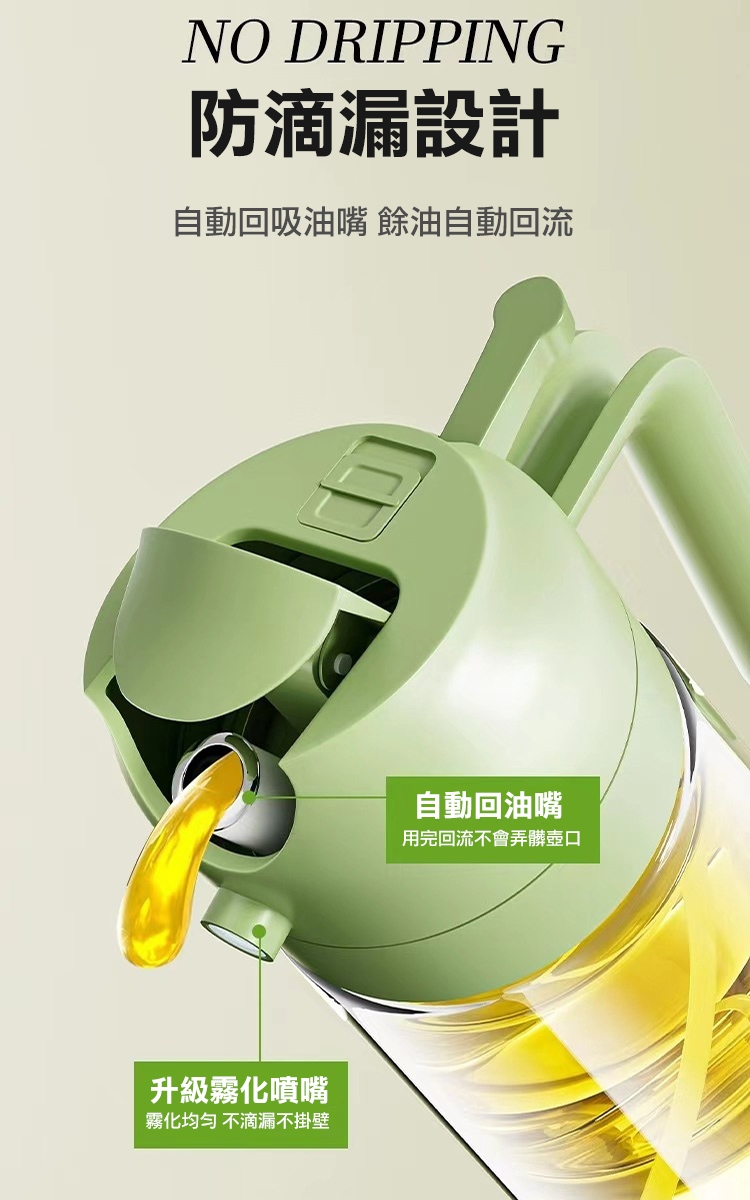 防滴漏設計,自動回吸油嘴,餘油自動回流,不弄髒壺口