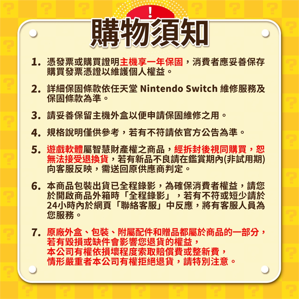 遊戲軟體:屬於智慧財產權商品,拆封後視為已購買,恕不接受退換貨。