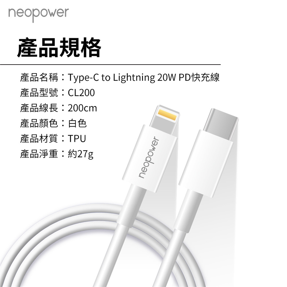 品名:Type-C to Lightning 20W PD快充線 (2M)