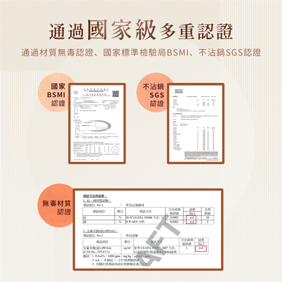 ●通過材質無毒認證、國家標準檢驗局BSMI、不沾鍋SGS認證