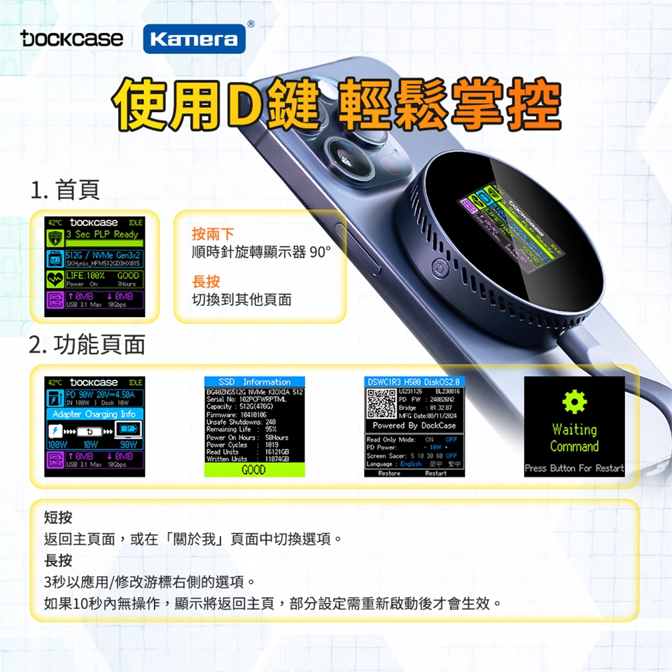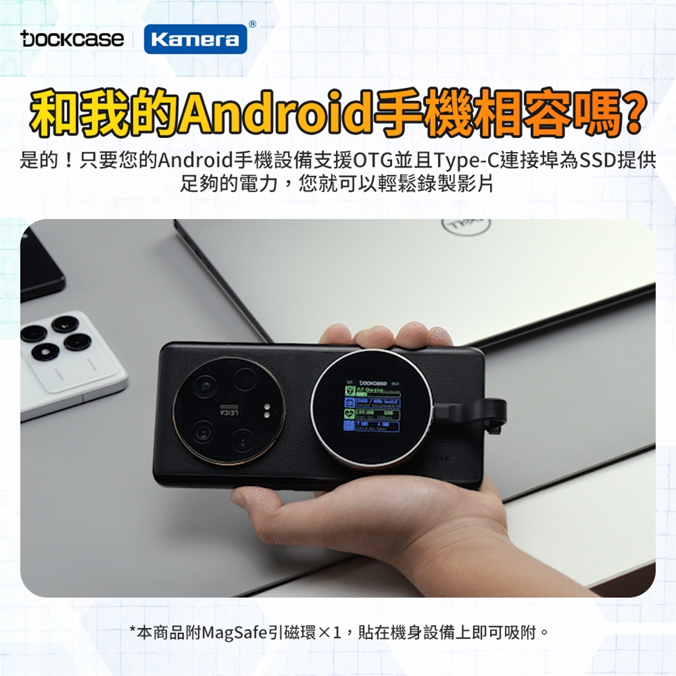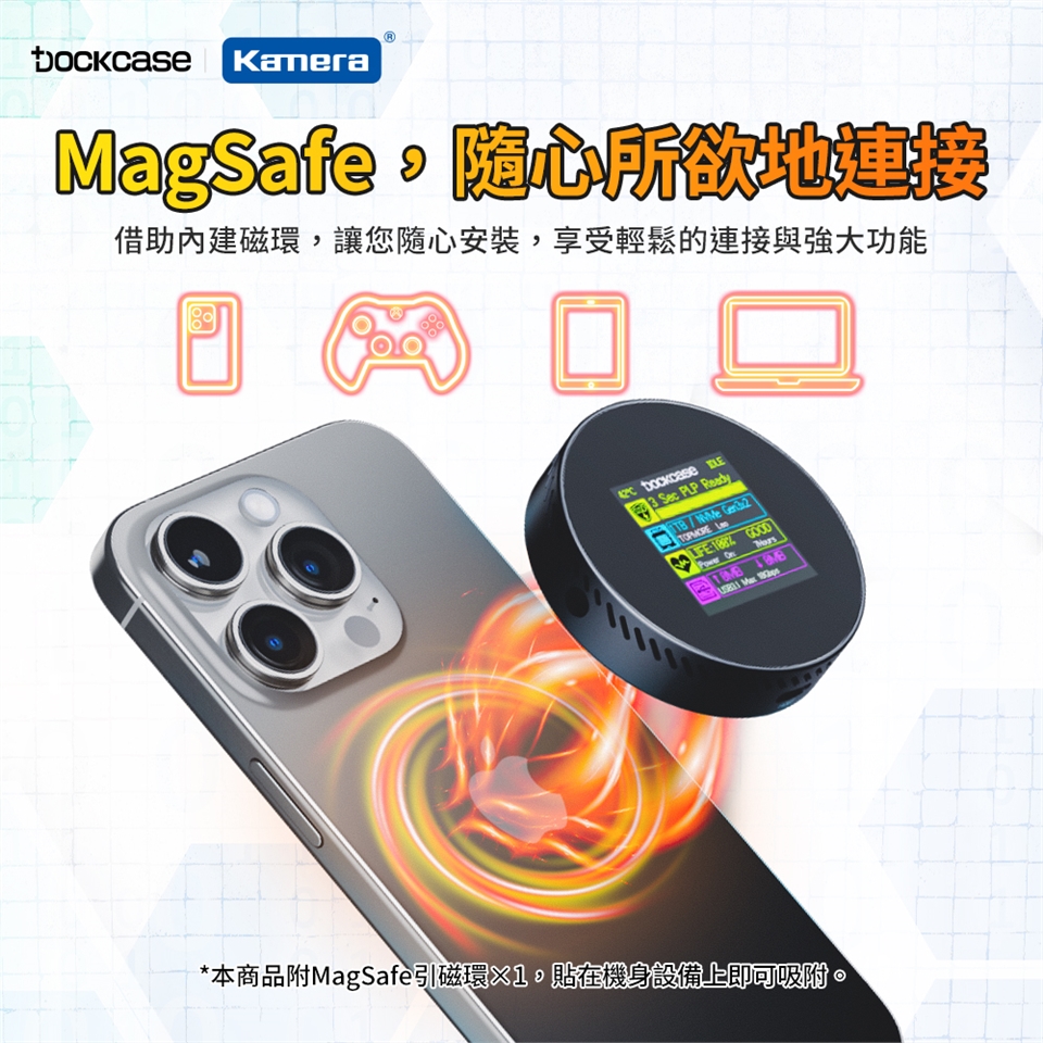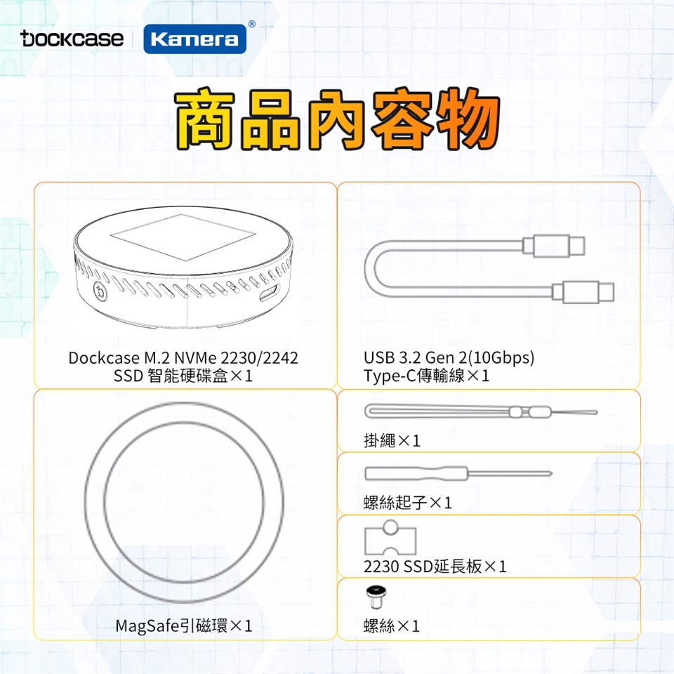 包裝內容:Dockcase M.2 NVMe 2230 2242 SSD 智能硬碟盒×1、USB 3.2Gen 2(10Gbps)Type-C傳輸線×1、MagSafe引磁環×1、掛繩×1、螺絲起子×1、2230 延長板×1、螺絲×1