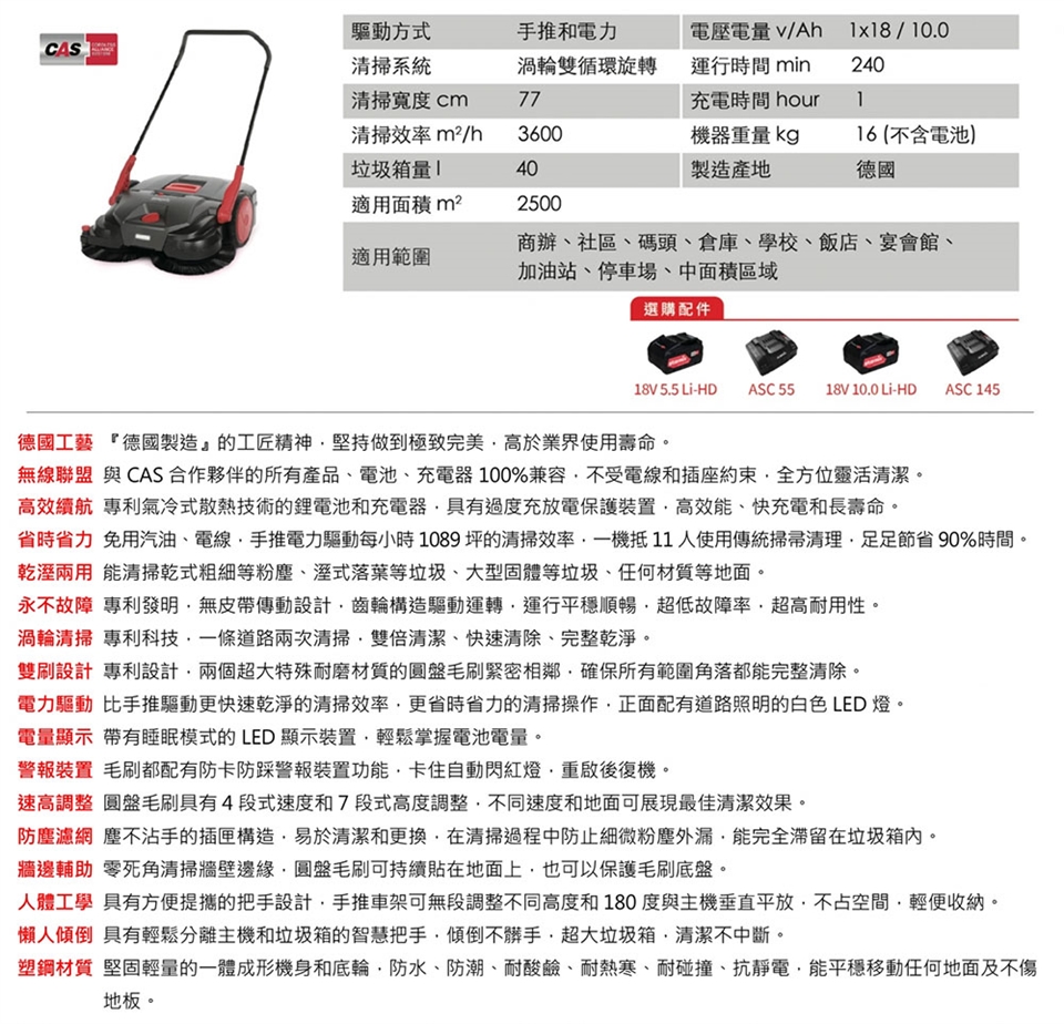 電力驅動:比手推驅動更快速乾淨的清掃效率,更省時省力的清掃操作,正面配有道路照明的白色LED燈。