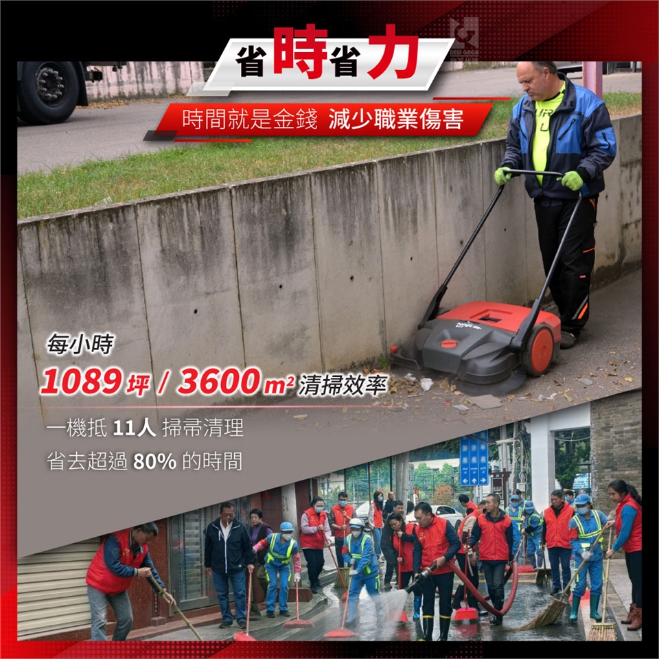 省時省⼒:免⽤電池、汽油、電線,⼿推驅動每⼩時1089坪的清掃效率,⼀機抵11⼈使⽤傳統掃帚清理。