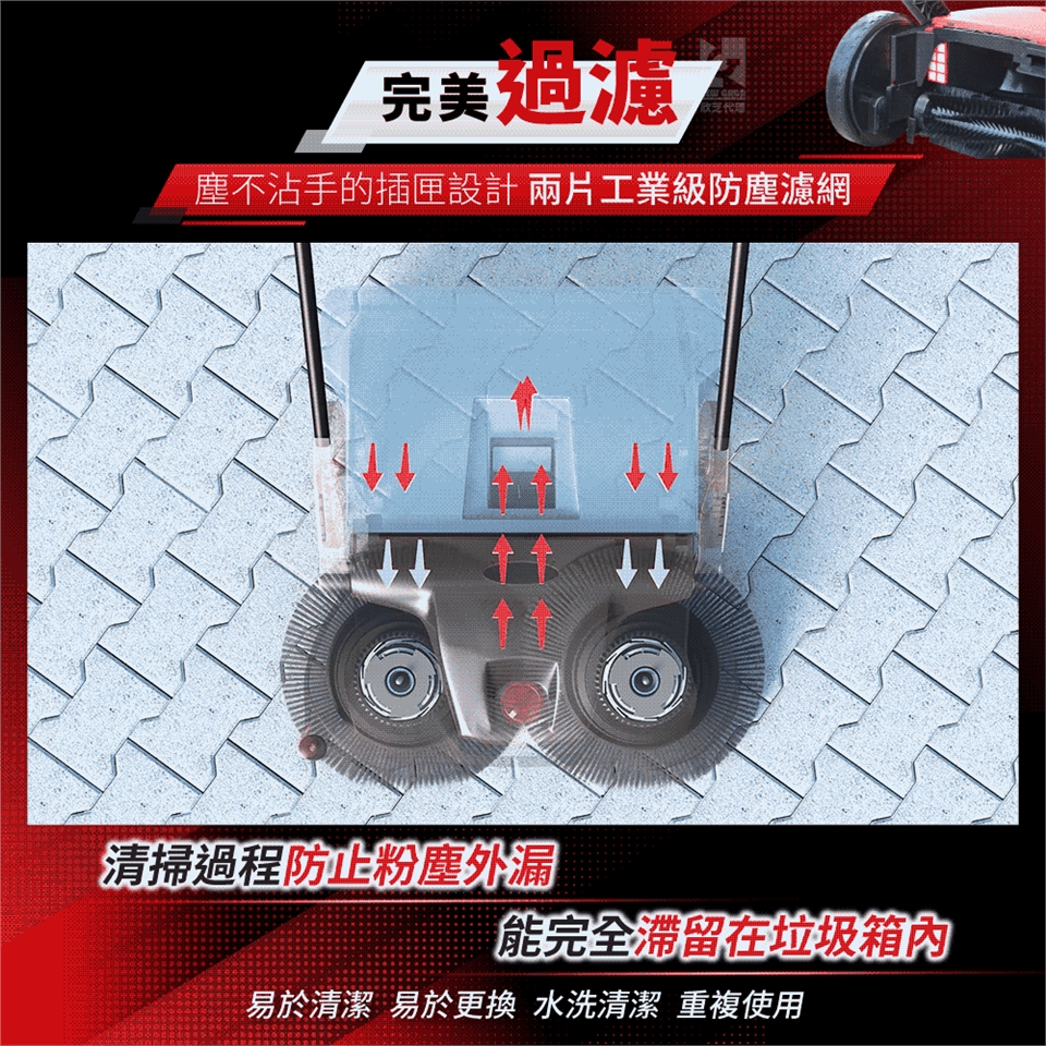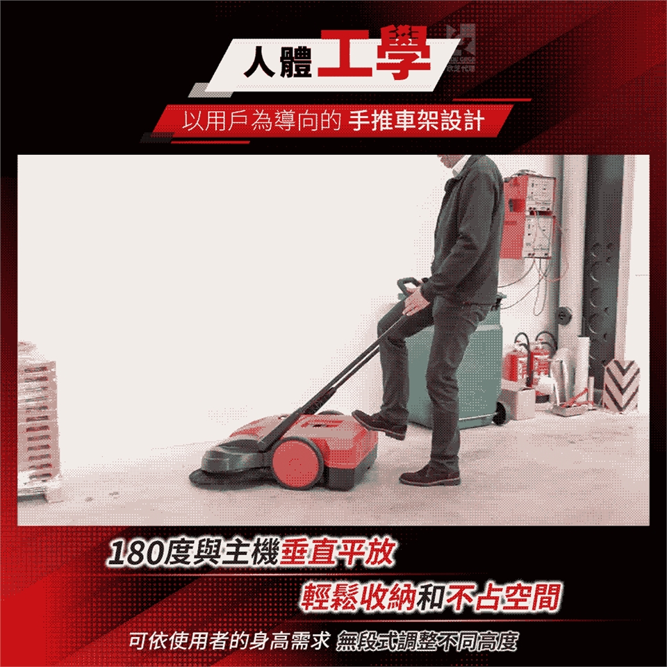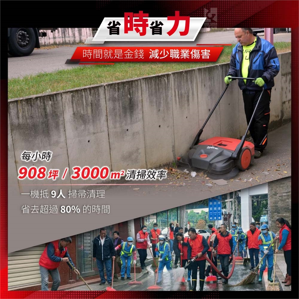 省時省⼒:免⽤電池、汽油、電線,⼿推驅動每⼩時908坪的清掃效率,⼀機抵9⼈使⽤傳統掃帚清理。