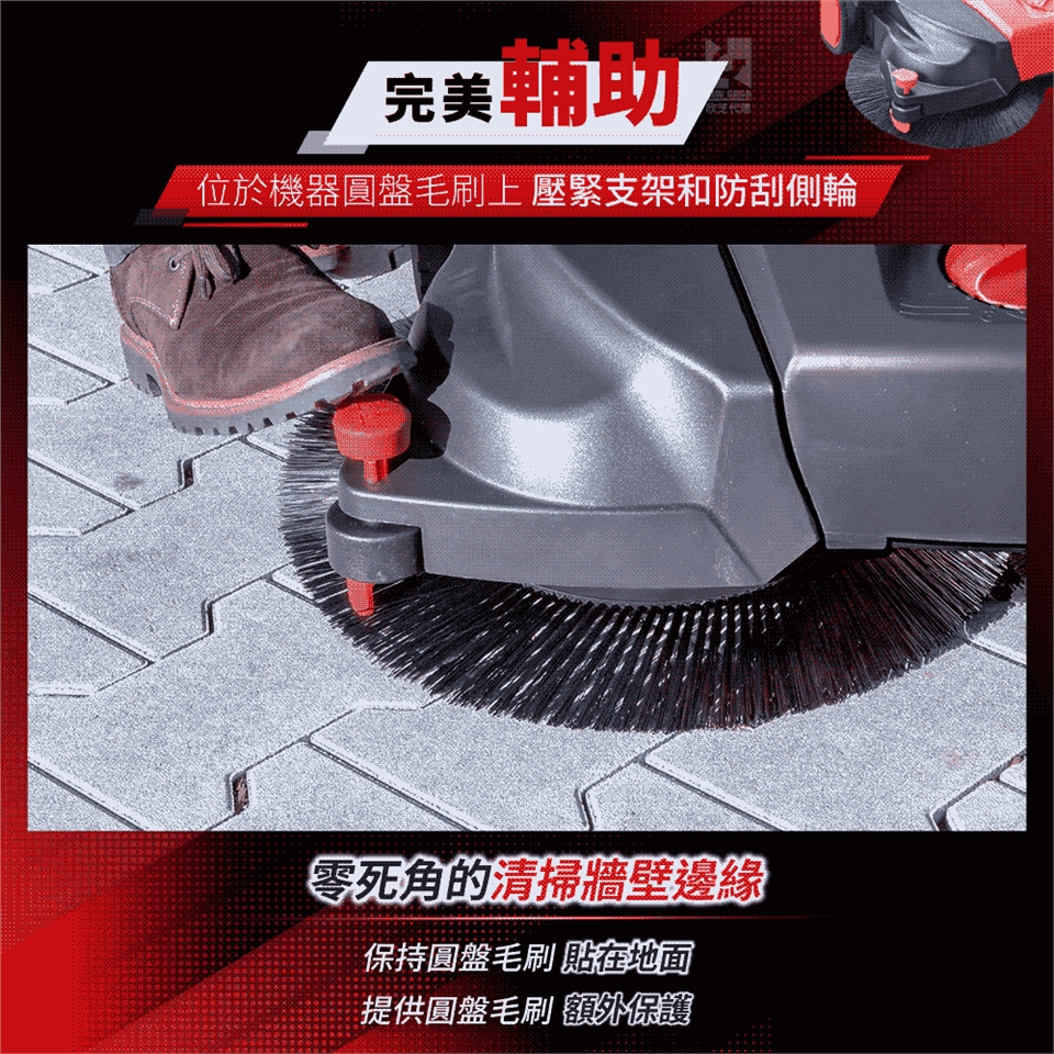 壓⼒輔助:清掃牆壁邊緣過程中,圓盤⽑刷可持續貼在地⾯上。