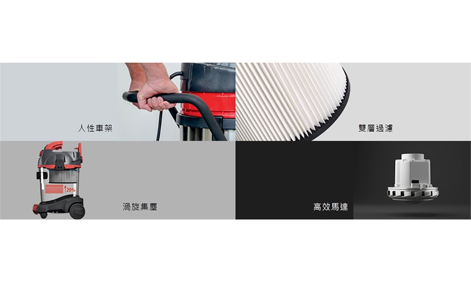 渦旋集塵:全球首創專利『渦輪旋風式』過濾集塵系統,粉塵在桶內像龍捲風一樣,360度旋轉而不阻塞,讓吸力有始至終不減弱。