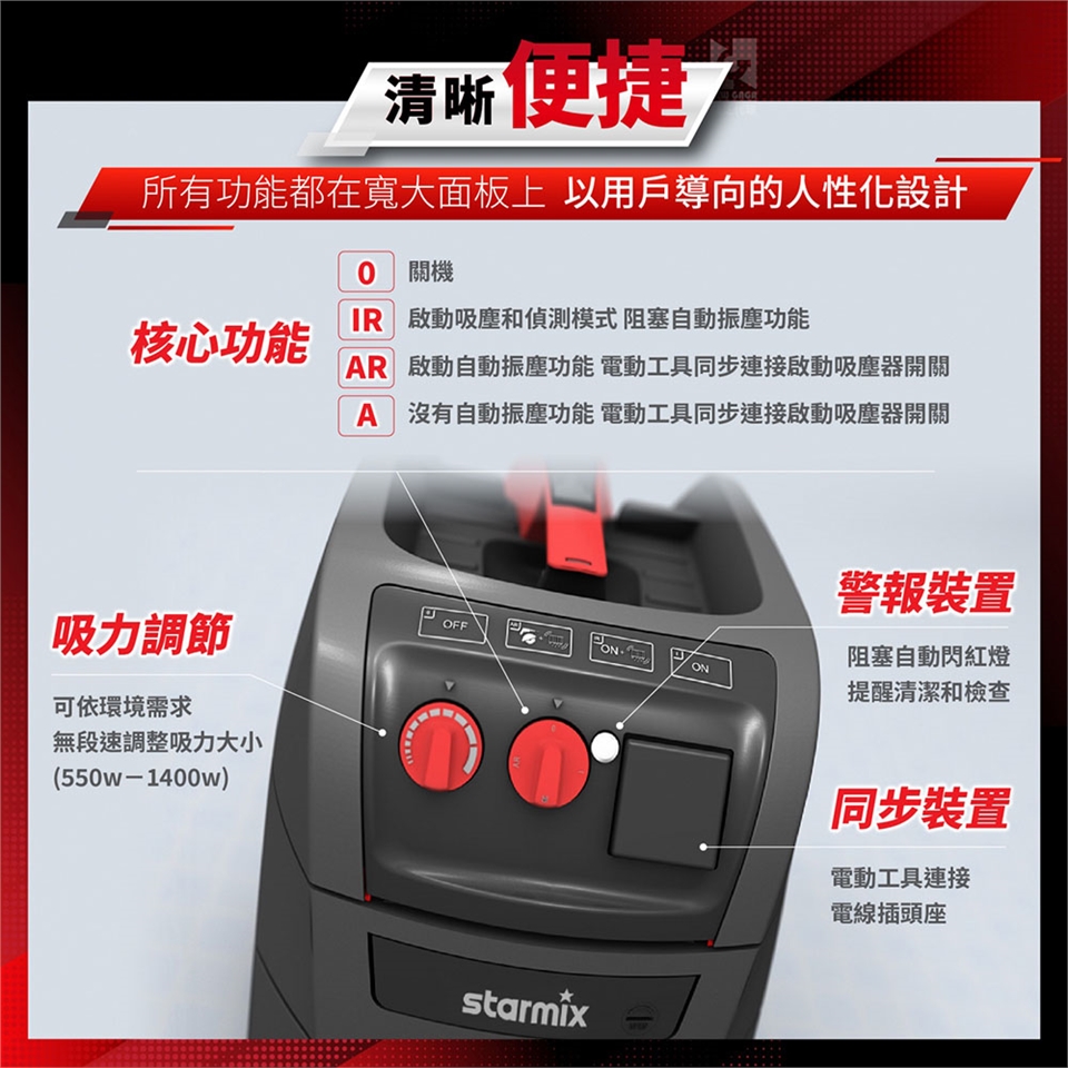 吸力調節:可依環境需求無段速調整吸力大小(550~1400w)。