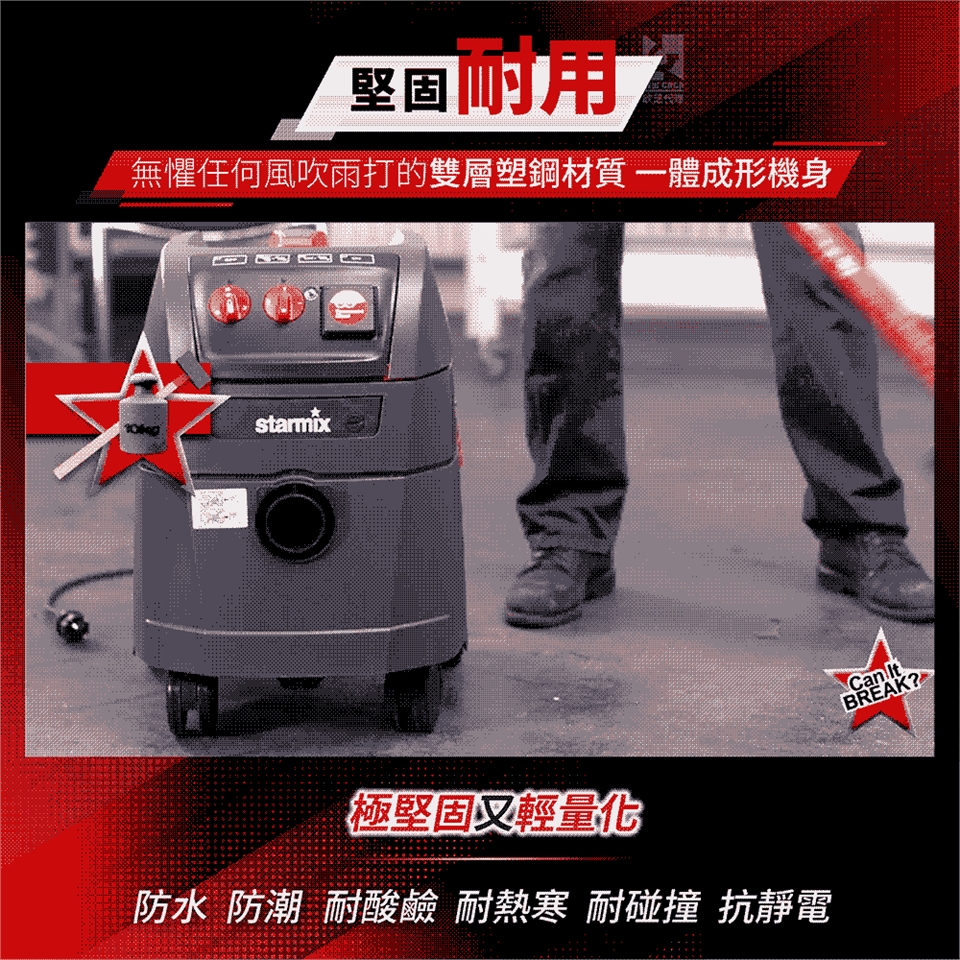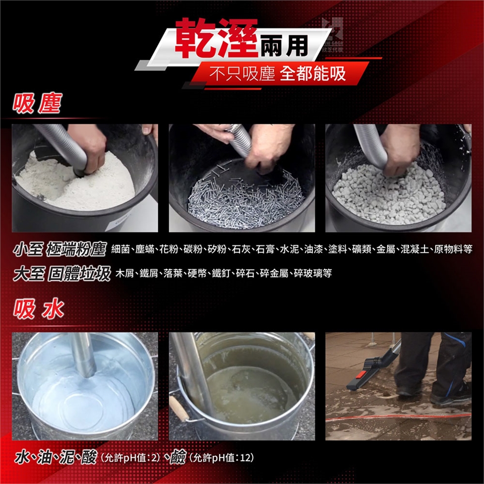乾溼兩用:乾溼發明者,吸塵、吸水、吸油、吸酸、吸鹼,不再只有吸塵。