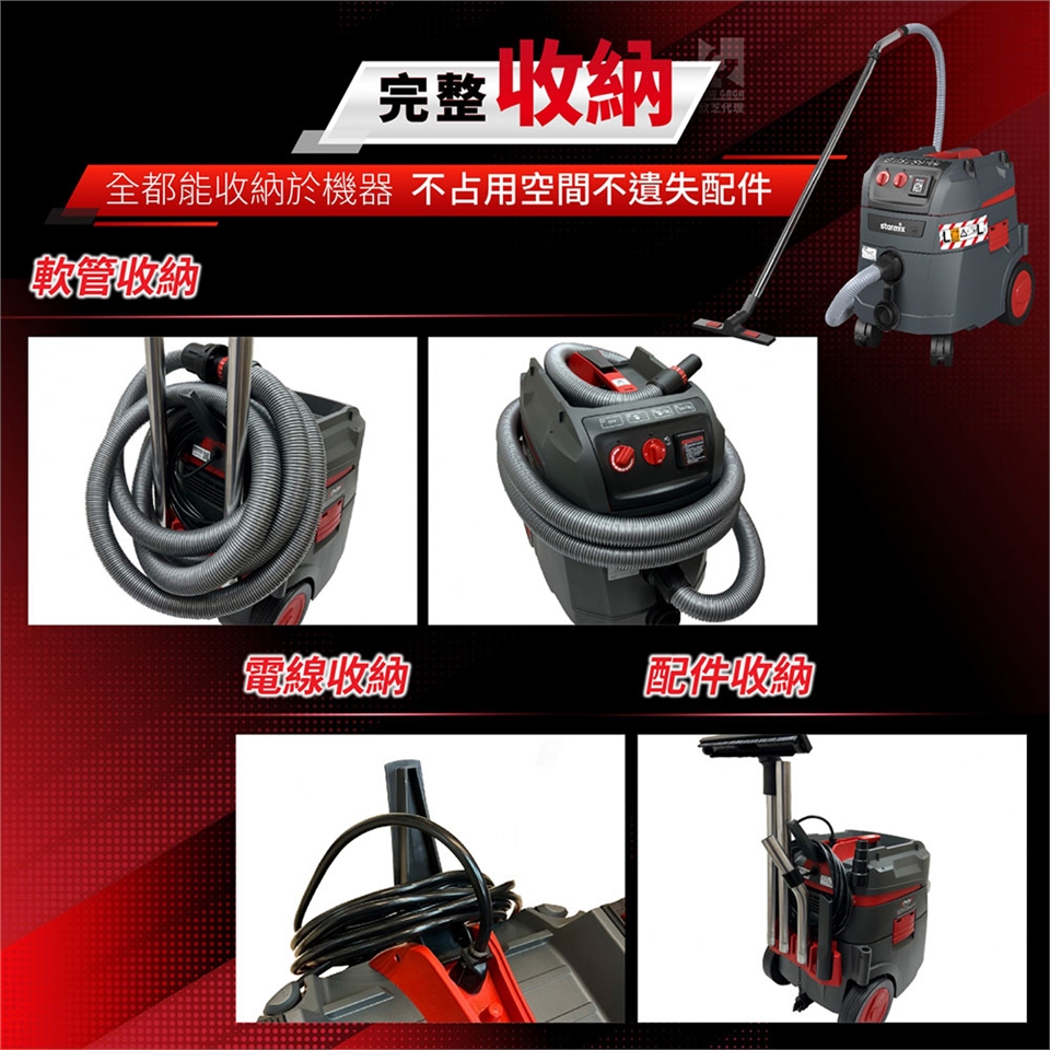 完整收納:配件、軟管、電線都能完整收納於機器,不占空間和遺失,機頭具有寬大溝槽設計,配件工具能完整放置。