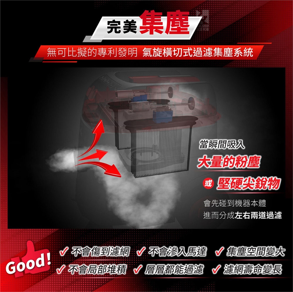 氣旋橫切:專利系統,過濾器平行放置於馬達左右兩邊,高效過濾集塵,超大過濾面積,能防止粉塵和液體滲入馬達裡。