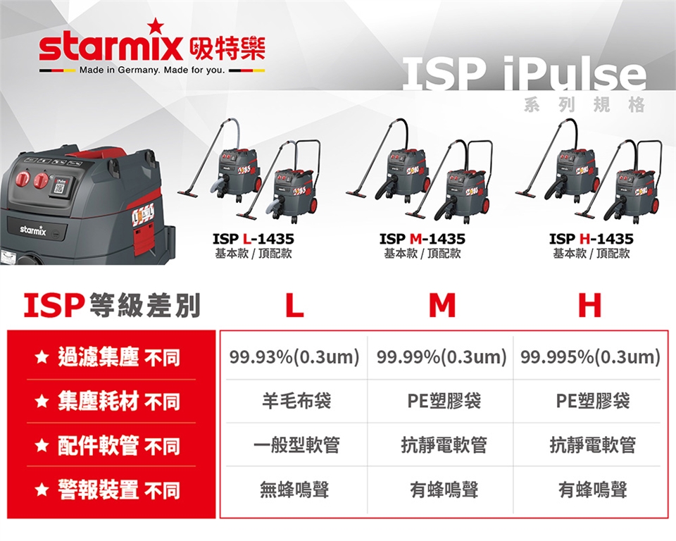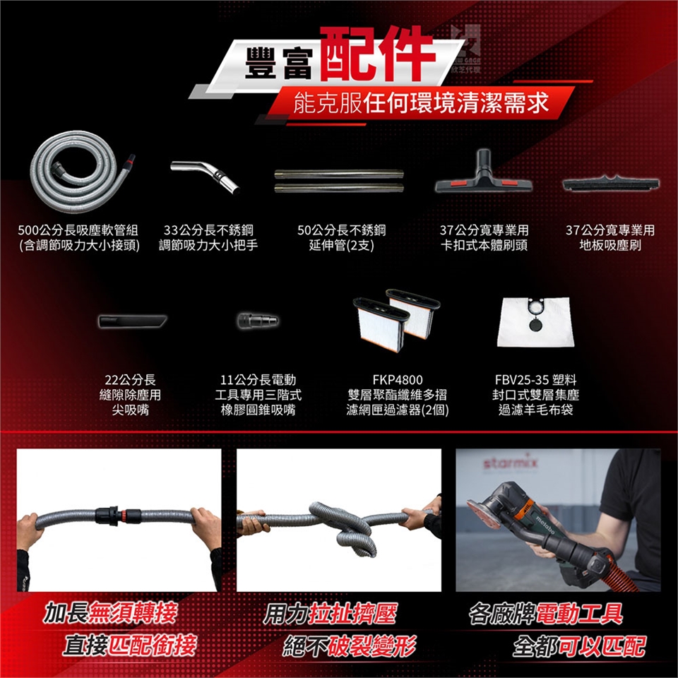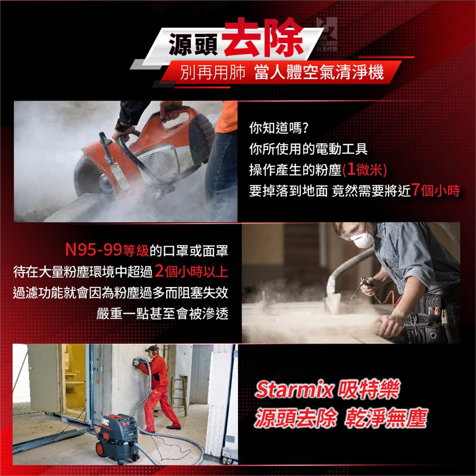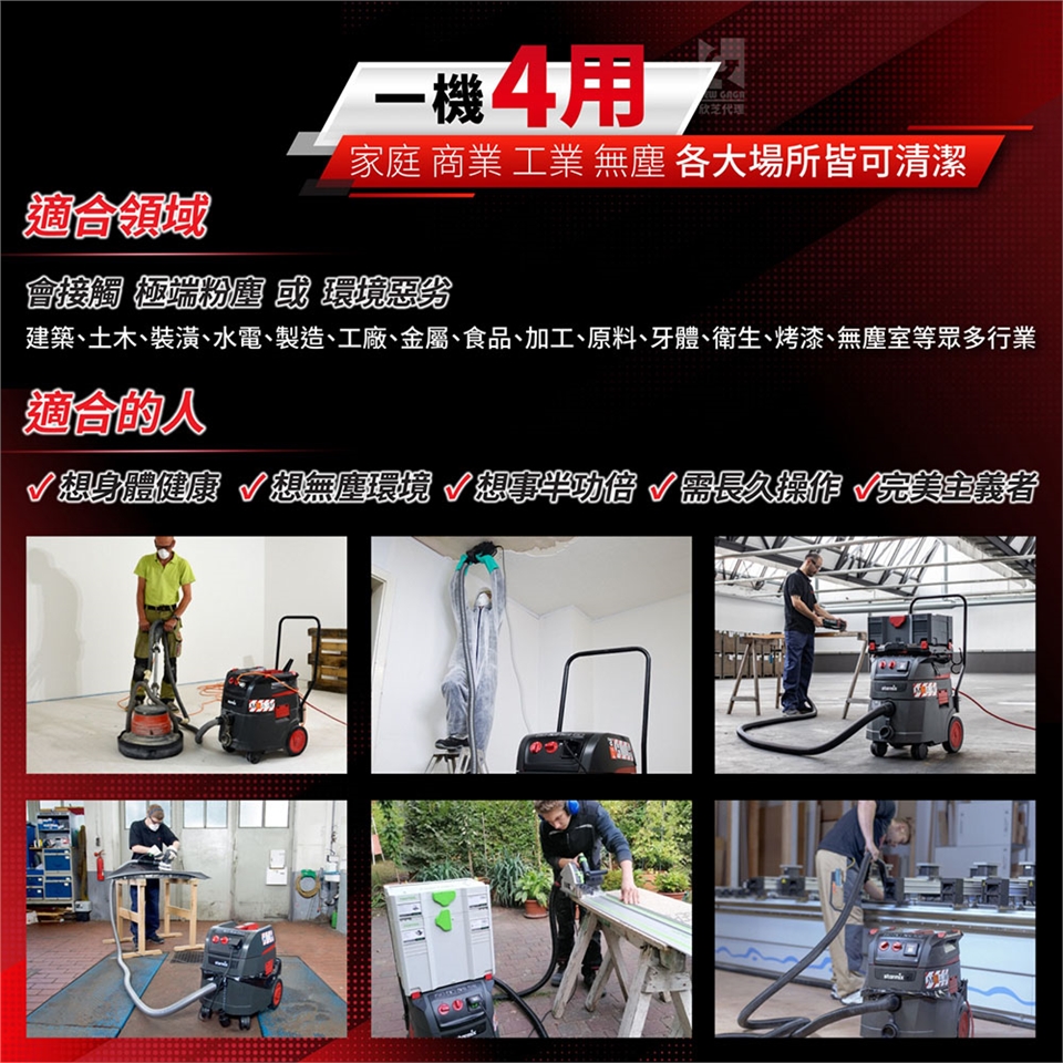 一機四用:家、商業、工業(極端粉末環境)、無塵(萬級以上等級),各大場所皆可清潔。