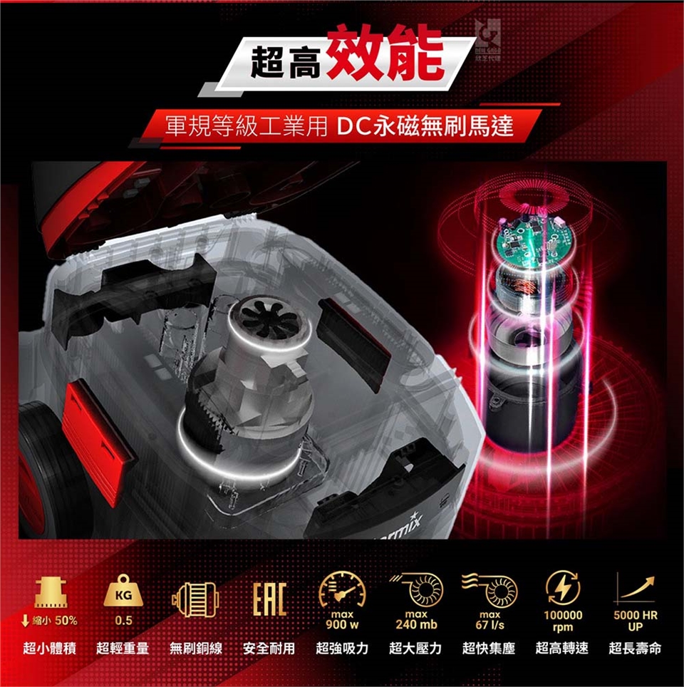 無刷馬達:純銅導線、安全耐用、超強吸力、超大壓力、超快集塵、超高轉速、超長壽命。