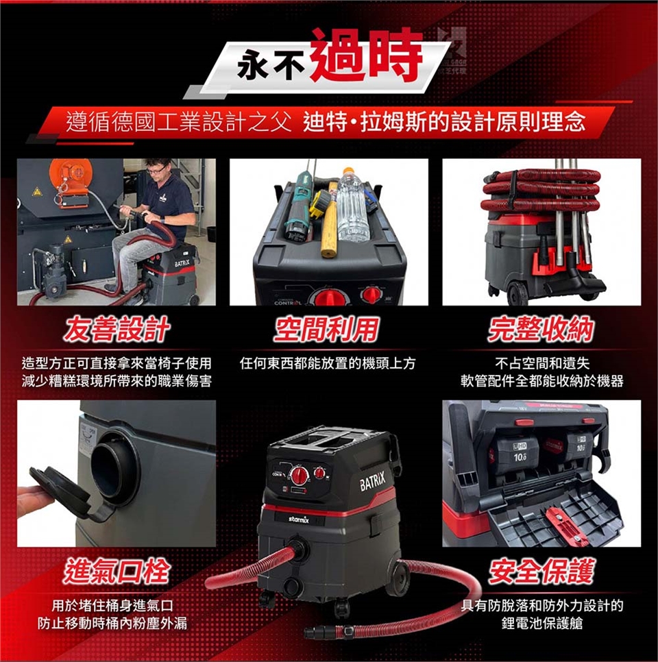 完整收納:配件、軟管、電線都能完整收納於機器,不占空間和遺失,機頭具有寬大溝槽設計,配件工具能完整放置。