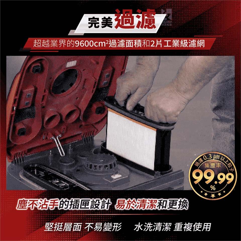 抗菌濾網:塵不沾手的插匣構造,易於清潔和更換,過濾小至細菌、塵螨、工業細粉等,大至木屑、落葉、玻璃碎片等。