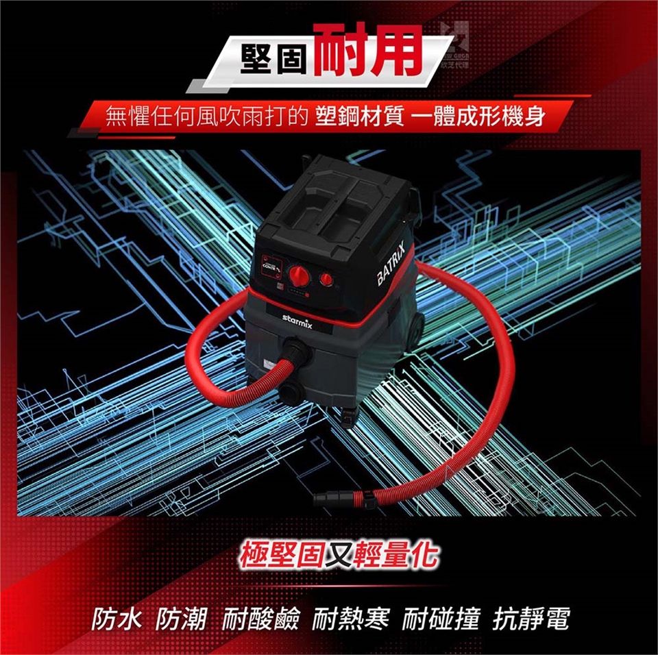 塑鋼機身:無懼任何風吹雨打的塑鋼材質一體成形機身,堅固又輕便,防水、防潮、耐酸鹼、耐熱寒、耐碰撞、抗靜電。