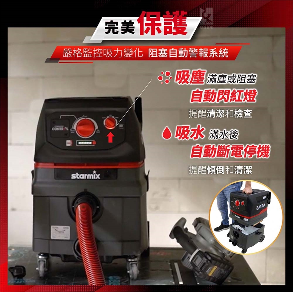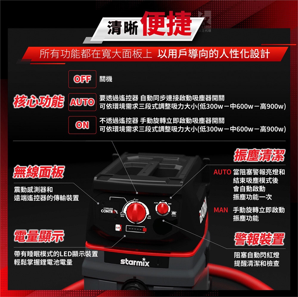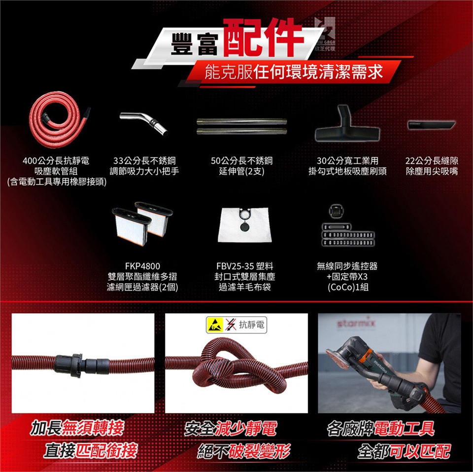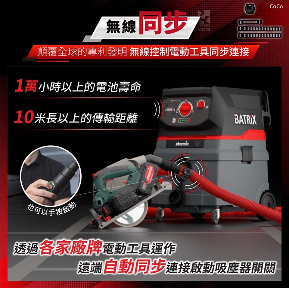 無線同步:專利發明,不受電源約束,透過電動工具運作,遠端自動同步連接啟動吸塵器開關,也可用手動方式連接。
