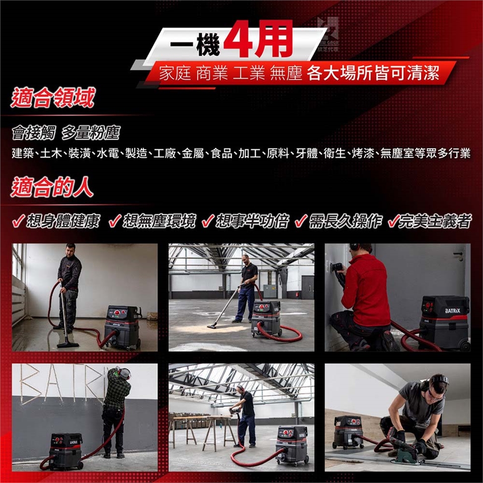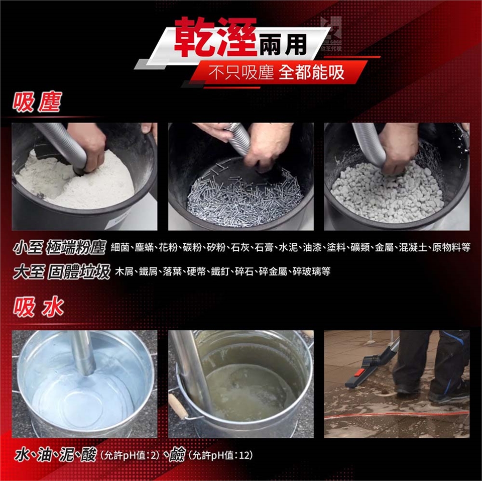 乾溼四用:乾溼發明者,吸塵、吸水、吸油、吸酸、吸鹼,家、商業、工業(多量粉末環境)、無塵(萬級以上等級)。