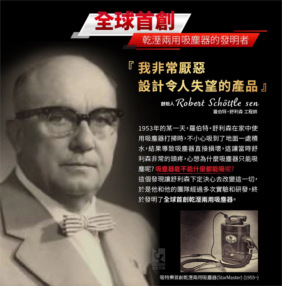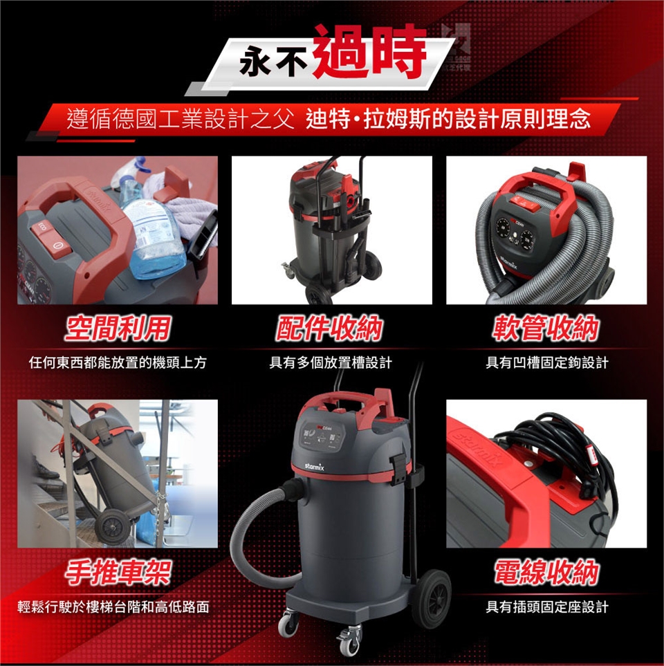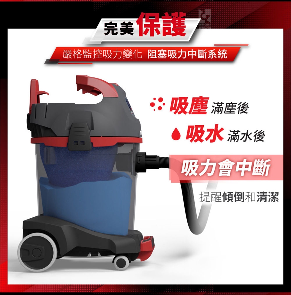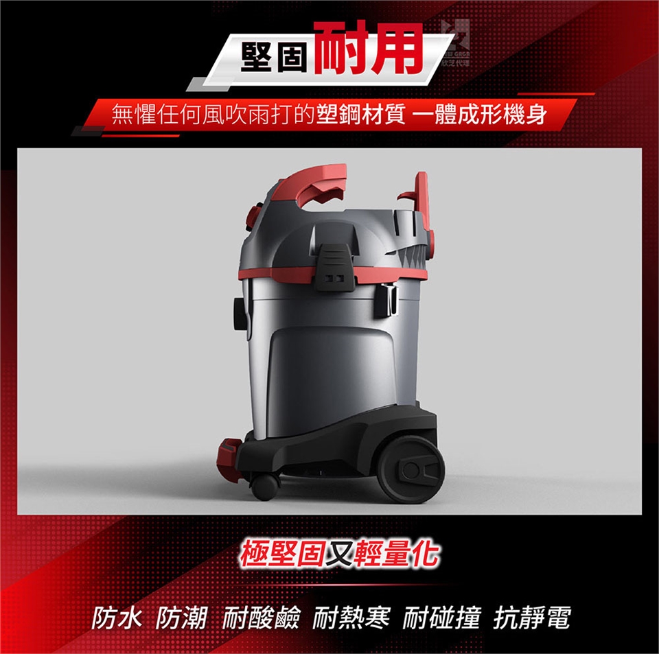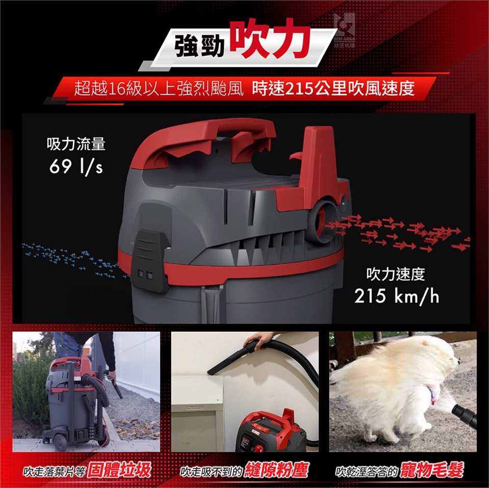 乾溼吹用:乾溼發明者,吸塵、吸水、吸油、吸酸、吸鹼及215km/h的強勁吹風,不再只有吸塵。