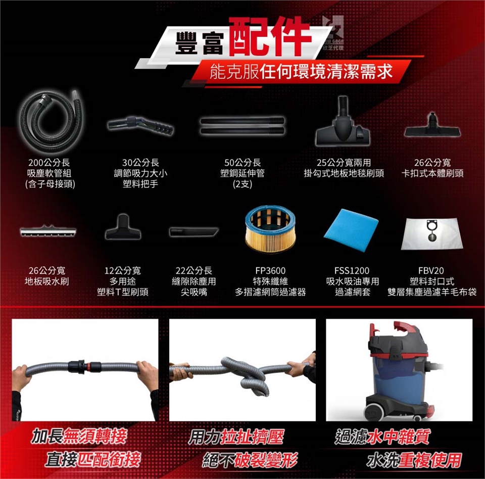 多樣配件:多種吸塵吸水配件,能清潔任何環境需求。