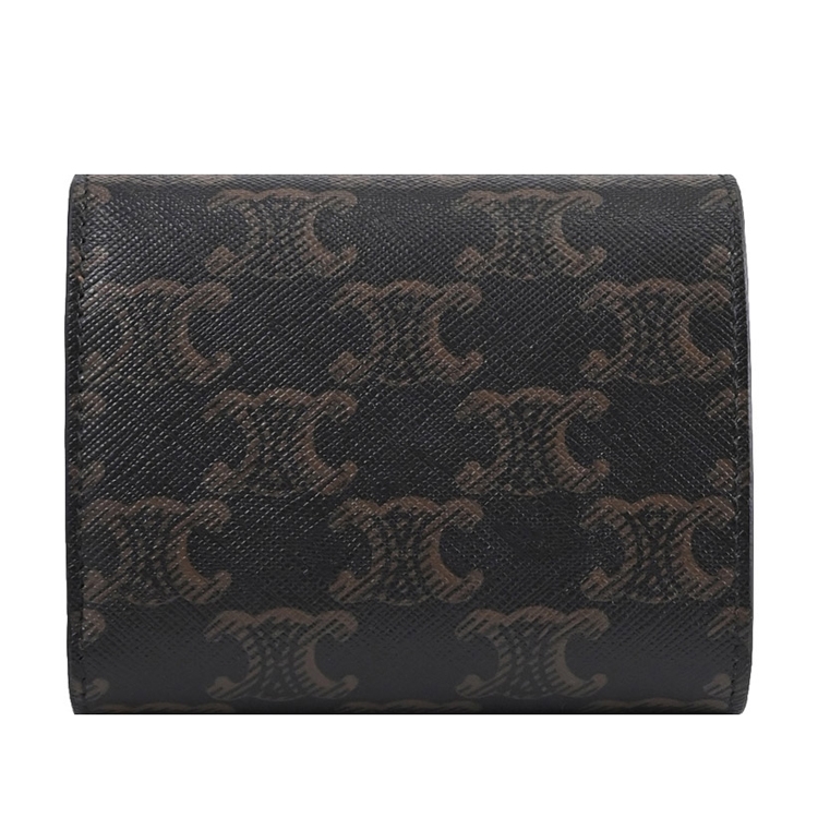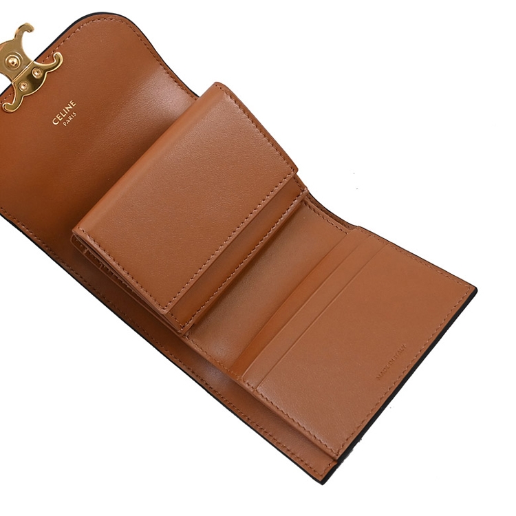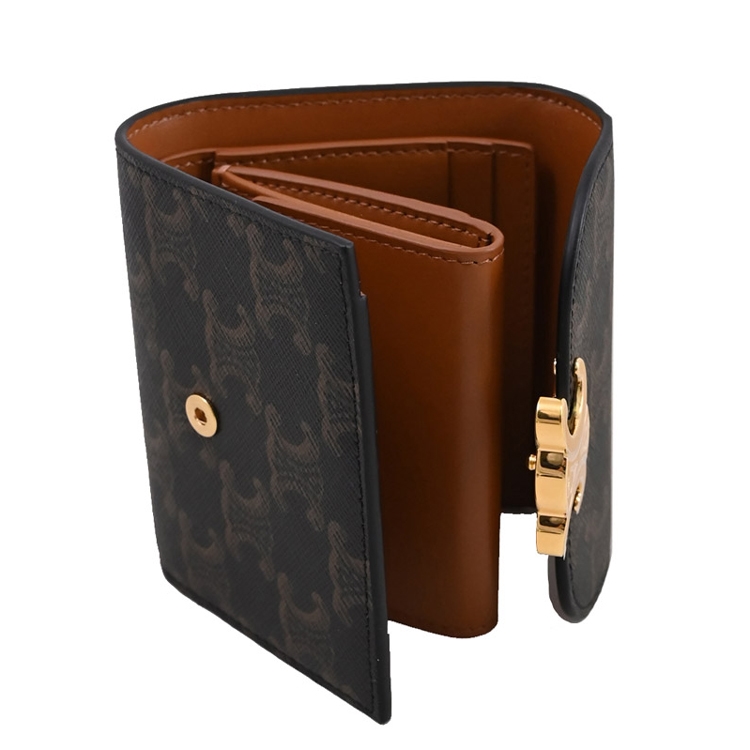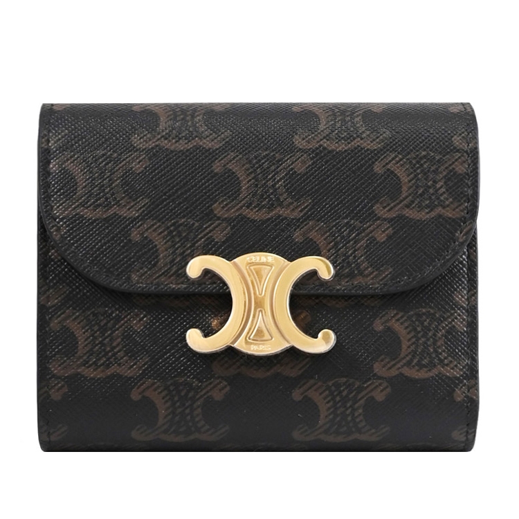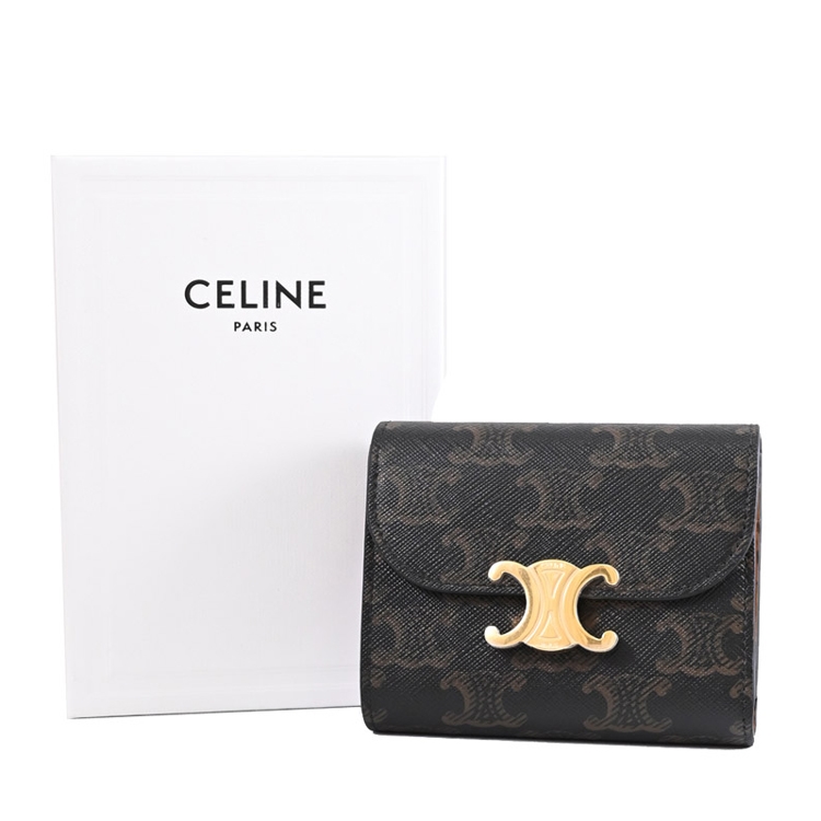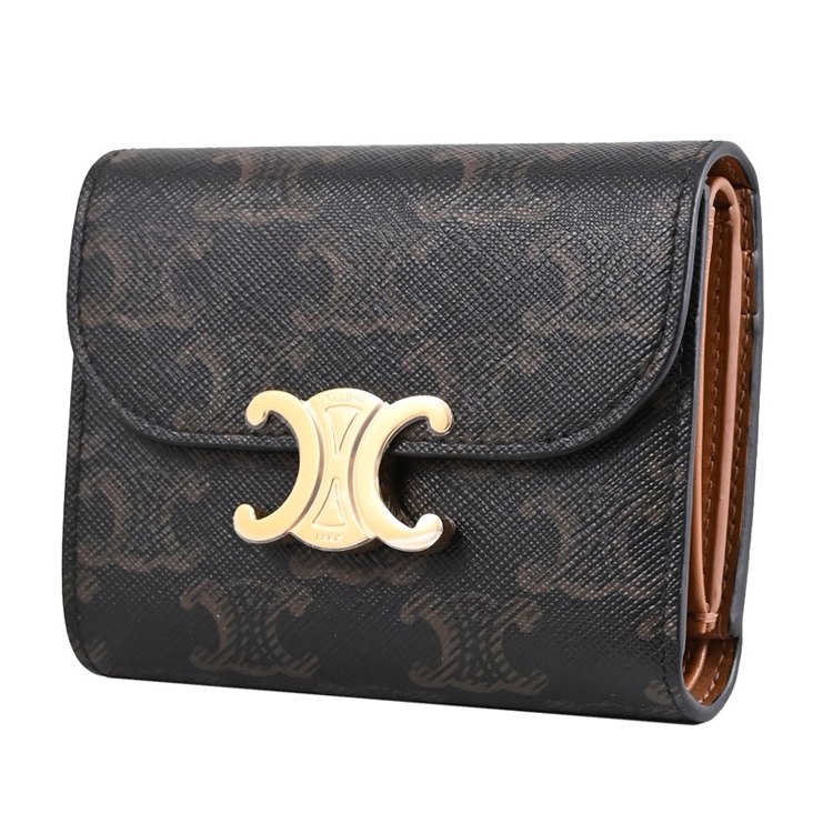 CELINE 法國奢侈時裝品牌,在設計總監Phoebe Philo帶領下,於2010年設計推出的Luggage囧臉包,因此得名,極簡風格逐漸深入人心,其魅力在台灣持續燃燒,此款是專櫃熱銷經典TRIOMPHE釦式三折短夾,使用品牌經典TRIOMPHE印花帆布(PVC)拼接質感小牛皮,搭配品牌金屬LOGO,壓釦開口/內有4信用卡夾層+2貼袋+1鈔票夾+1釦式零錢袋可供納,簡約時尚的釦式短夾,可放小包好收納,顯出低調奢華的質感,都會時尚感,搶眼又好搭風格。