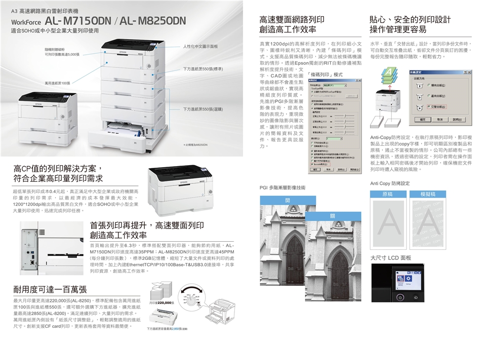 - 先進的PGI 多階漸層影像技術,提高色階的表現力,重現微妙的圖像陰影與層次感,讓附有照片或圖片的簡報資料及文件、報告更具說服力。