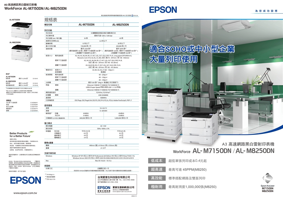 - 最大月印量高達 150,000 張,標準配備包含萬用進紙匣 100 張與進紙槽 550 張。