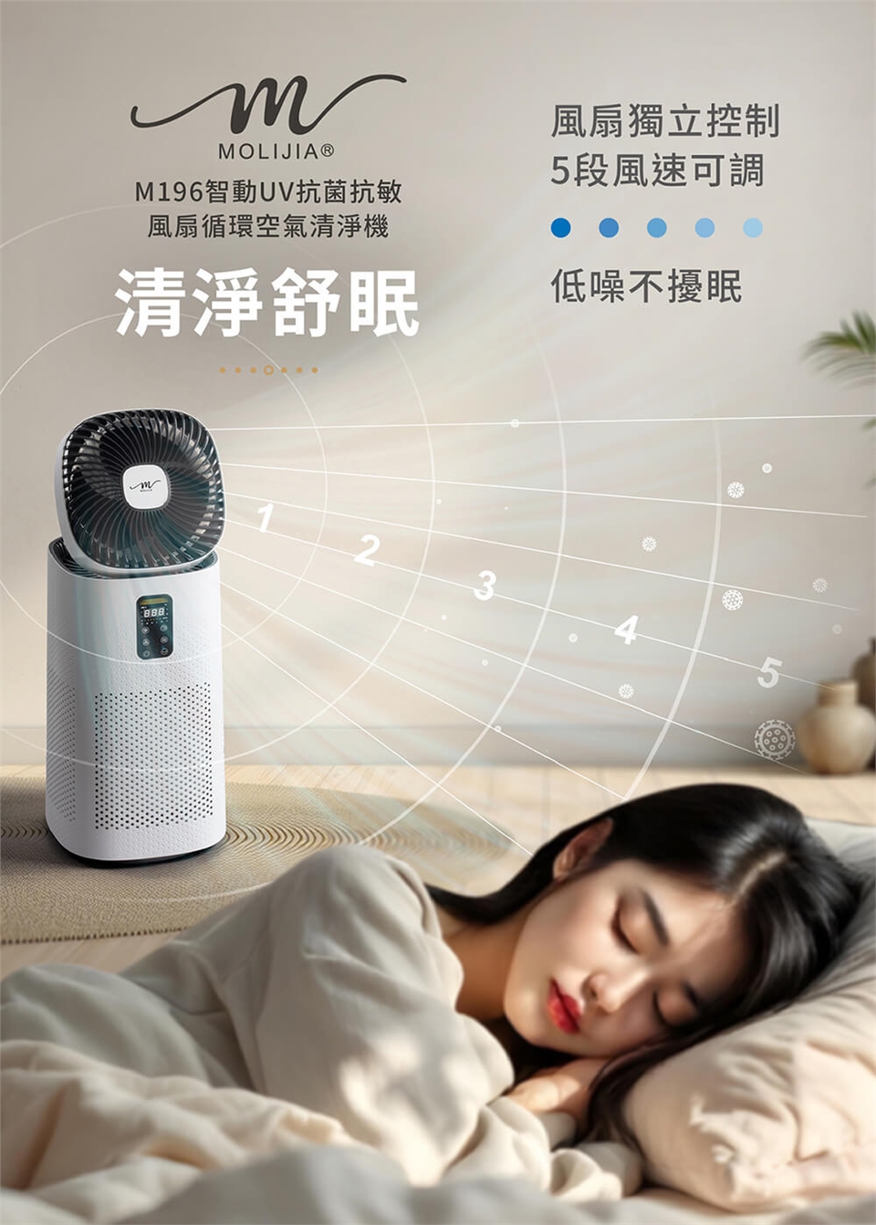產品名稱:【MOLIJIA 魔力家】M196 智動UV抗菌抗敏風扇循環空氣清淨機