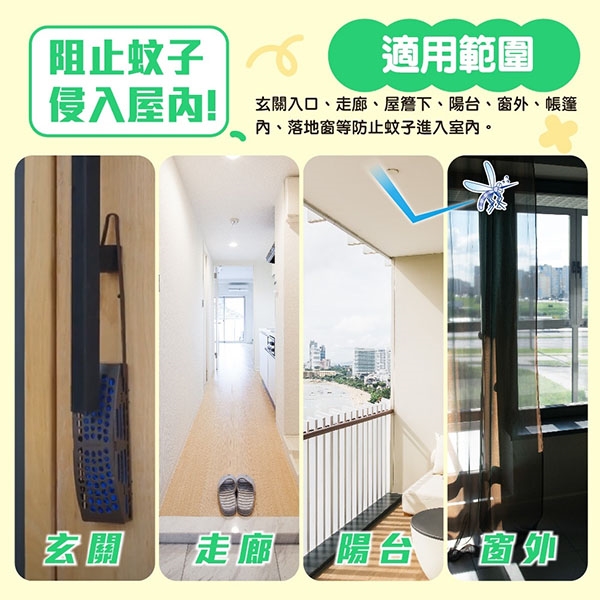 屋簷下、陽台、窗外、帳棚內、落地窗等防止蚊子進入室內;或者花圃、自行車放置處、