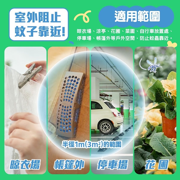 晾曬衣物處、帳棚外等戶外空間,防止蚊蟲靠近。