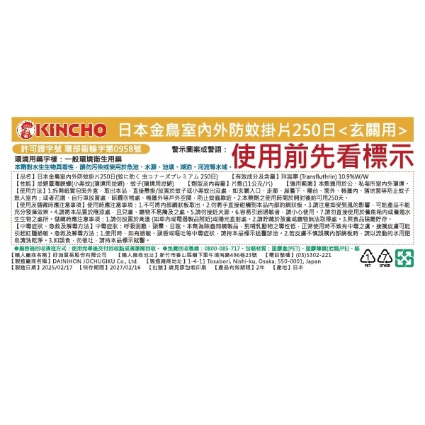 日本金鳥室內外防蚊掛片250日:環部衛輸字第0958號