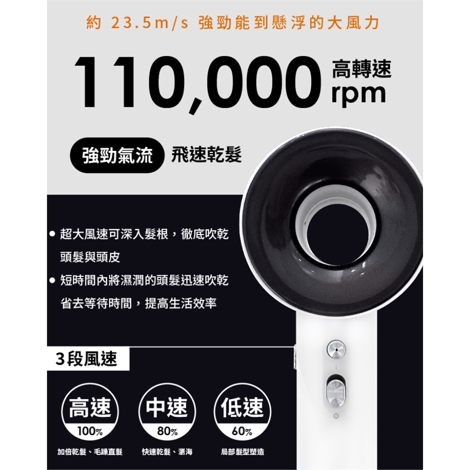 | ◆110,000rpm高轉速,颶風風速23.5m/s |