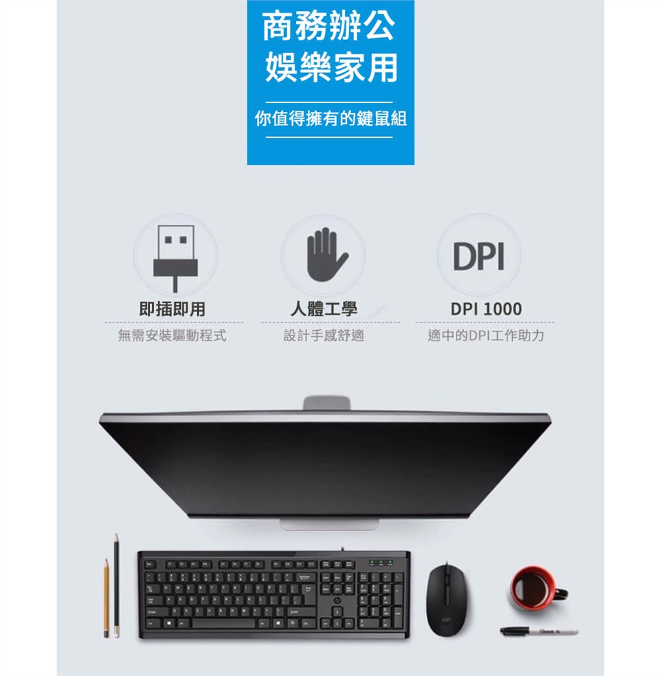 HP 惠普 KM10 有線 鍵盤滑鼠組,採用美式鍵盤版本(無倉頡注音),人體工學設計貼合手型,按鍵回饋佳打字不容累。隨插即用,只需要一個接收器。