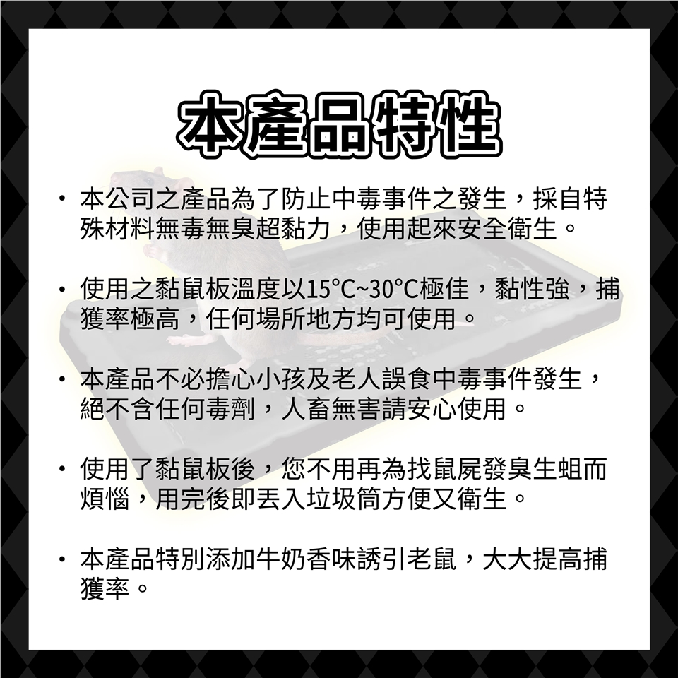 ◎ 勿將黏鼠板放置於風沙灰塵繁多之處,且勿放在空氣潮溼之場所,以防止黏膠黏性減低。