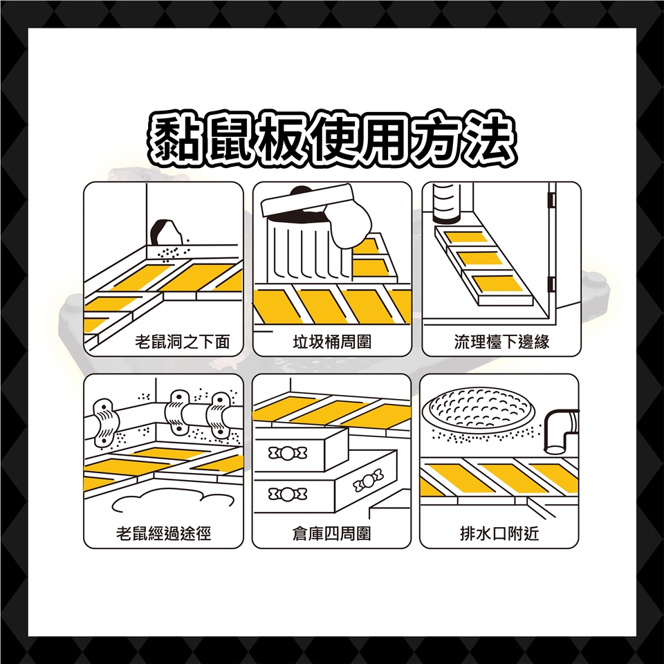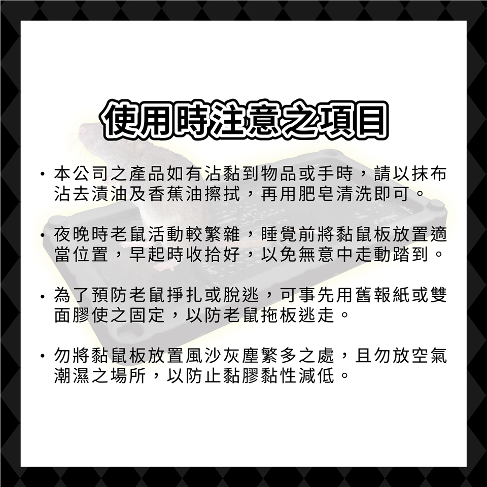 ◎ 夜晚時老鼠活動較繁雜,睡覺前將黏鼠板放置適當位置,早起時收拾好,以免無意中走動踏到。