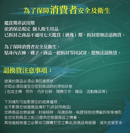 ◆審閱期退貨條件:個人貼身衣物基於衛生考量,除商品本身有瑕疵,車縫不良、髒汙、破損可退換貨外(退換貨需為原始包裝狀態,並需包含贈品),商品若拆封、損毀、拆除吊牌、有異味、香味、髒汙、經洗滌過後即不可退貨。