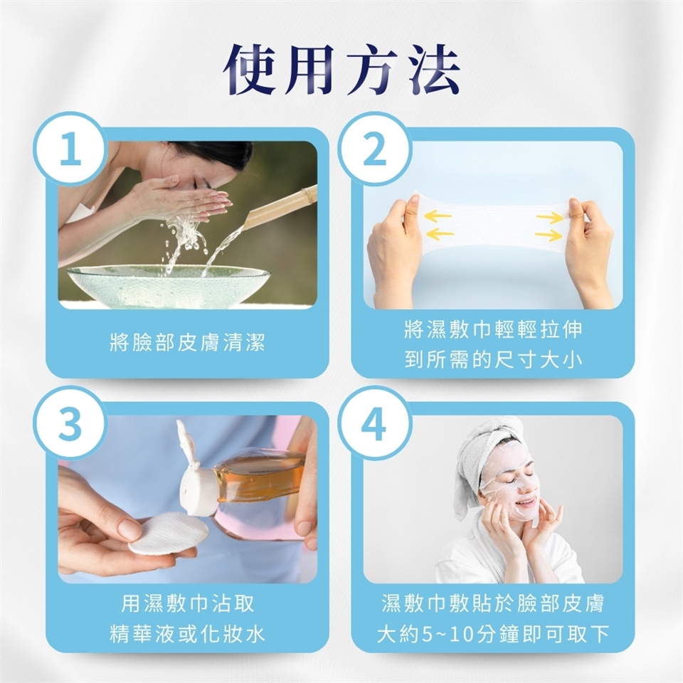 1.用濕敷巾沾取精華液或化妝水,輕輕拉伸到所需的尺寸大小,敷貼於臉部皮膚大約5~10分鐘即可取下。
