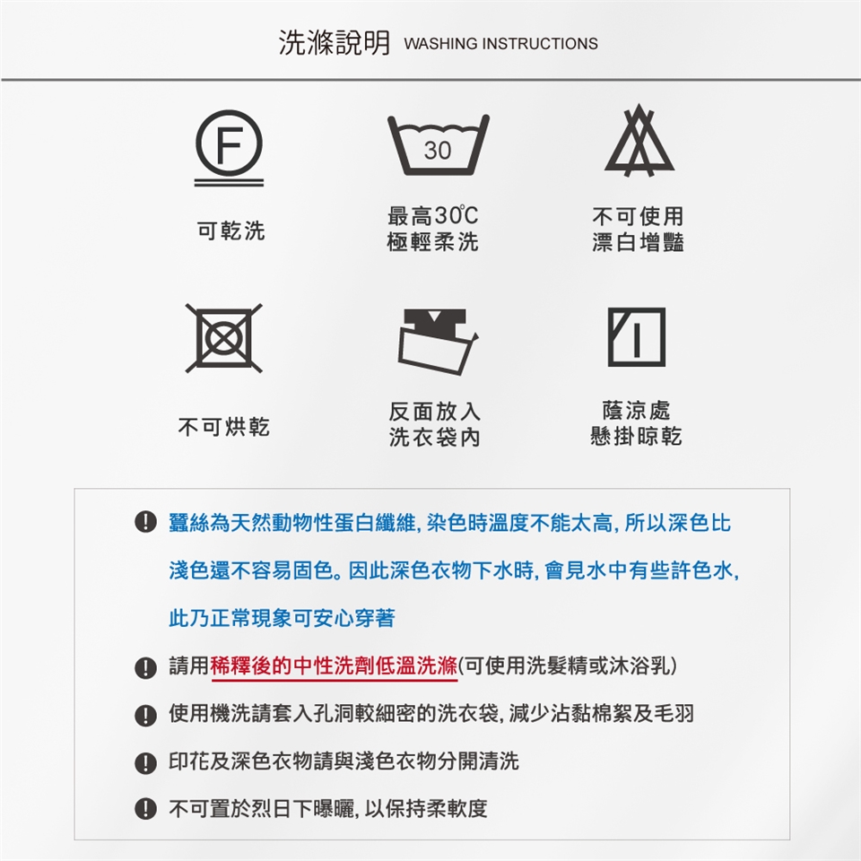 ► 寢具(被套、床包、枕頭套)皆可水洗,清洗時請翻反面,拉上拉鍊(留5公分左右開口),以冷水稀釋「非酵素型中性洗劑」後清洗,不可浸泡,避免使用烘乾機。