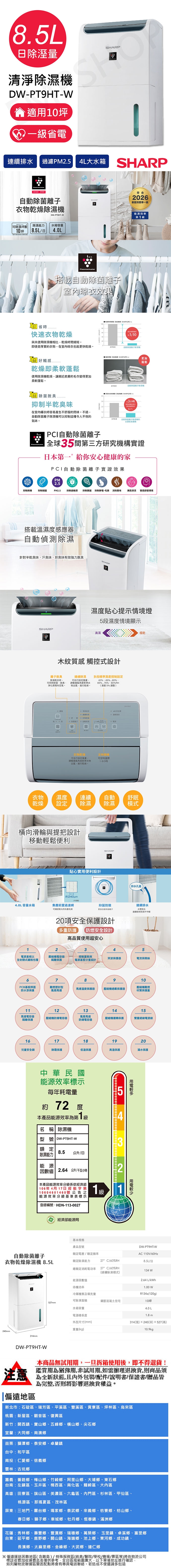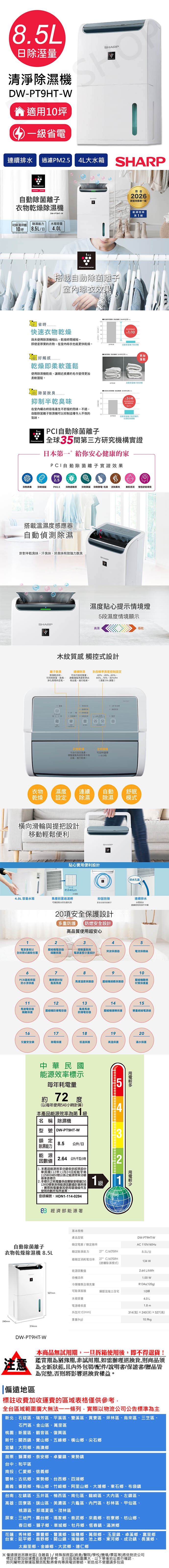 【夏普SHARP】8.5L自動除菌離子除濕機 DW-PT9HT-W