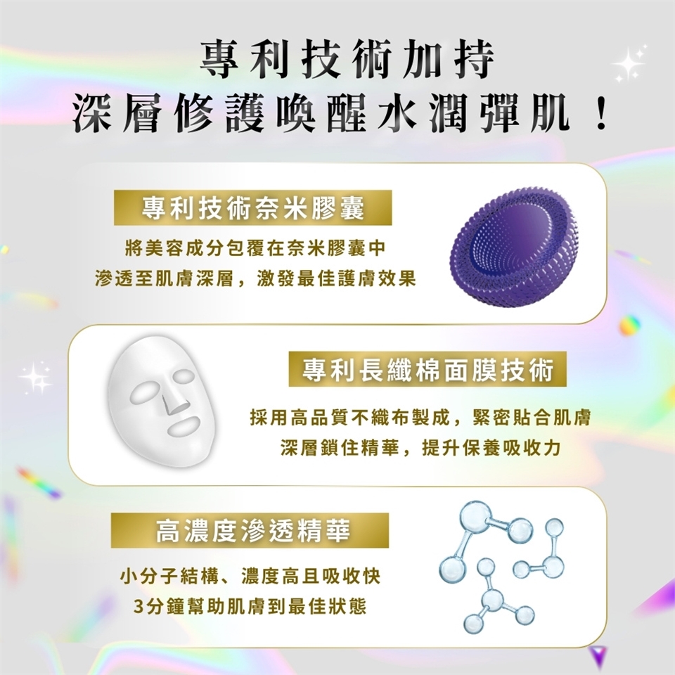 ● 專利技術將美容成分包覆於奈米膠囊中,高附著力滲透至肌膚深層,激發最佳護膚效果。
