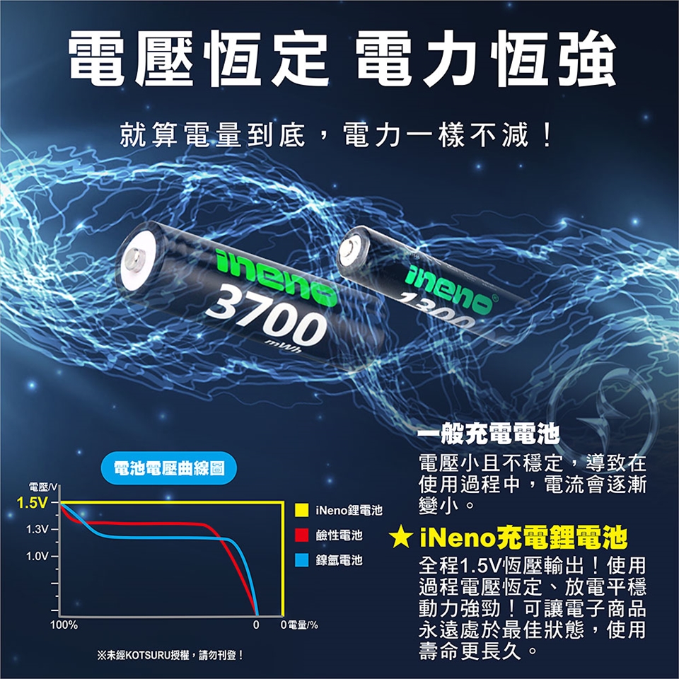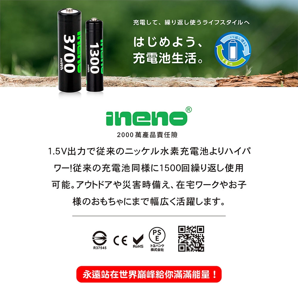 ineno鋰電池適合使用大電流要求的電器產品,恆壓電池電量用完前電力並不會減弱。可充達1500次並無記憶效應,也不會漏液並不含鉛汞的環保安全電池可安心使用。