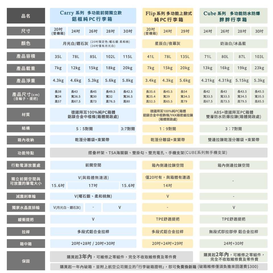 - 箱體是使用德國拜耳100%純PC材質,此材質多用於防彈玻璃、太空人頭盔面罩...等,因此能夠防刮耐磨,遇外力可快速回彈,拖運不易摔壞