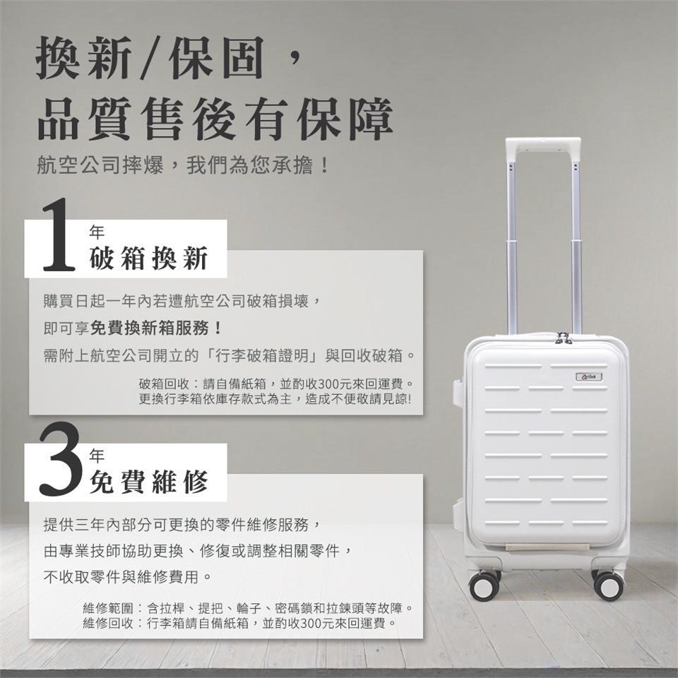 - 購買起三年內,可維修之零組件,包含輪子、拉桿、密碼鎖、提把等消耗品,完全不收取維修費及零件費