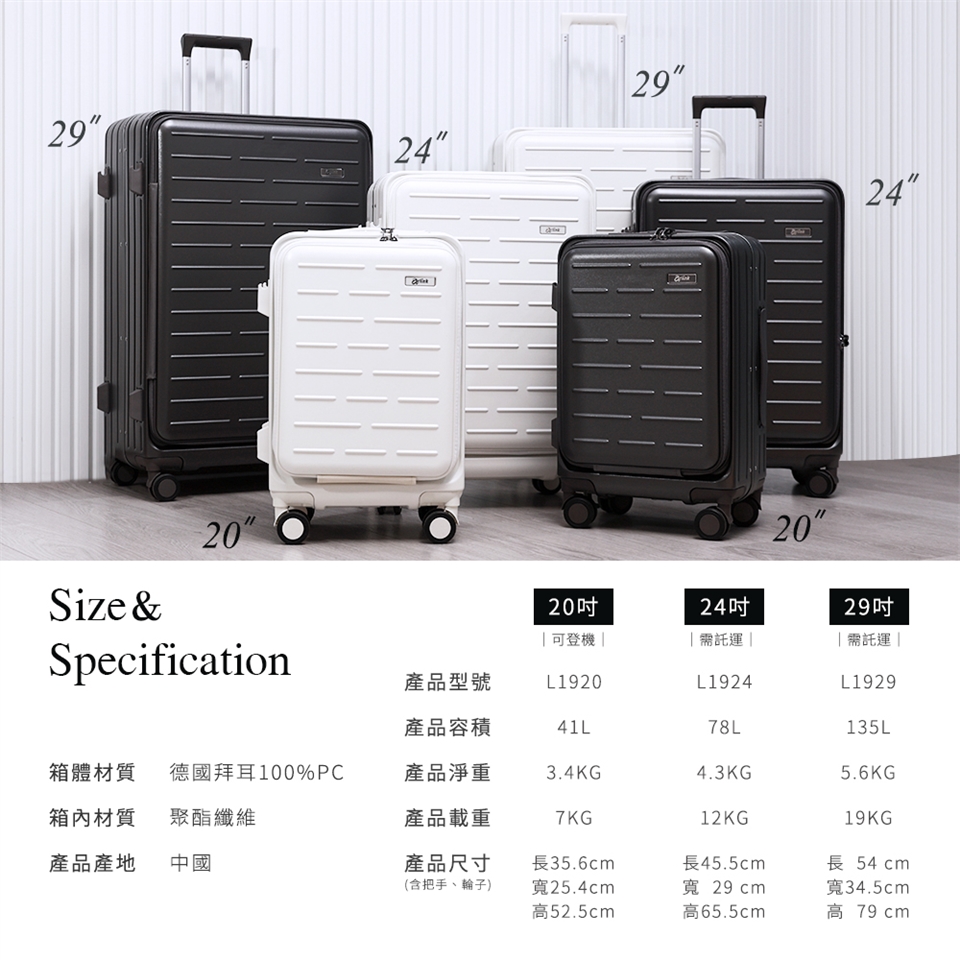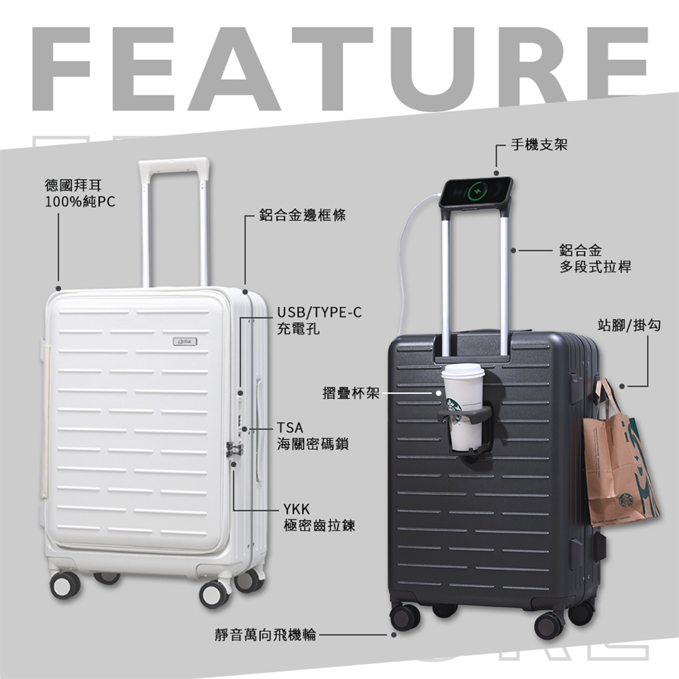 ●20吋登機箱限定直立式開口設計,可輕鬆拿取平板、筆電、充電線...等隨身物品